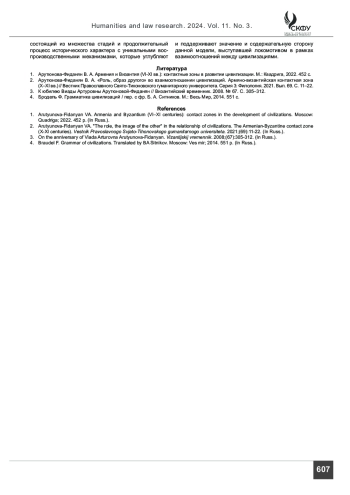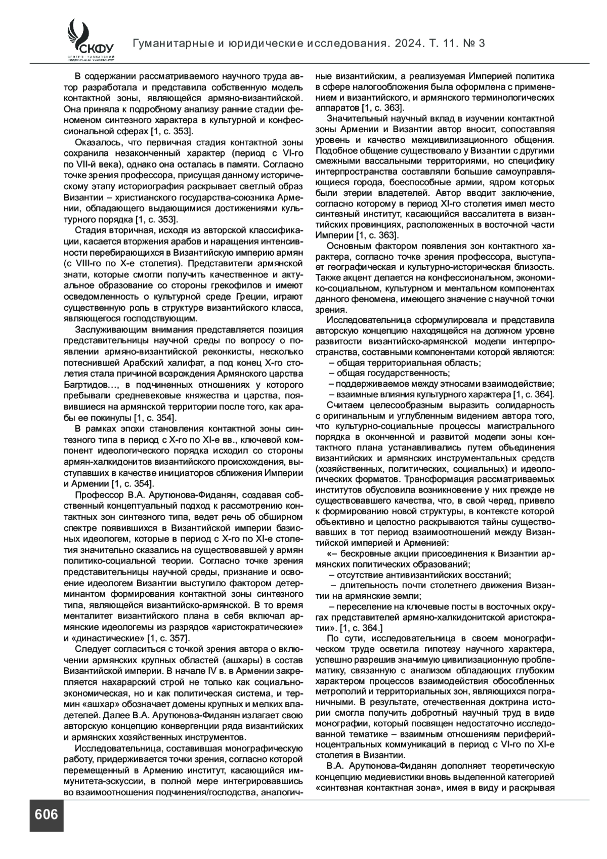 Для цитирования: Вартумян А. А. Арутюнова-Фиданян В. А. Армения и Византия (VI–XI вв.): контактные зоны в развитии цивилизаций. М.: Квадрига, 2022. 452 с. Гуманитарные и юридические исследования. 2024;11(3):605–607. https://doi. org/10.37493/2409-1030.2024.3.26