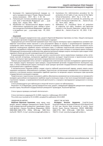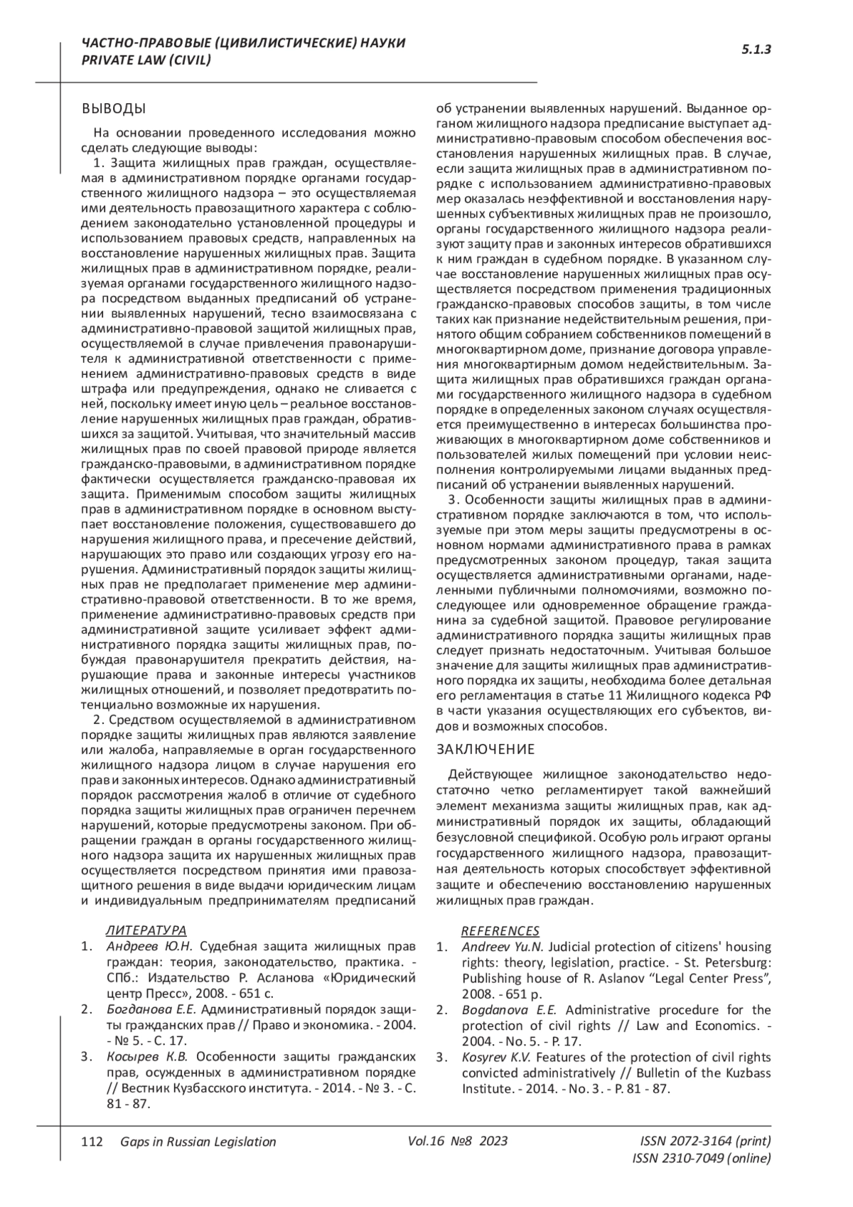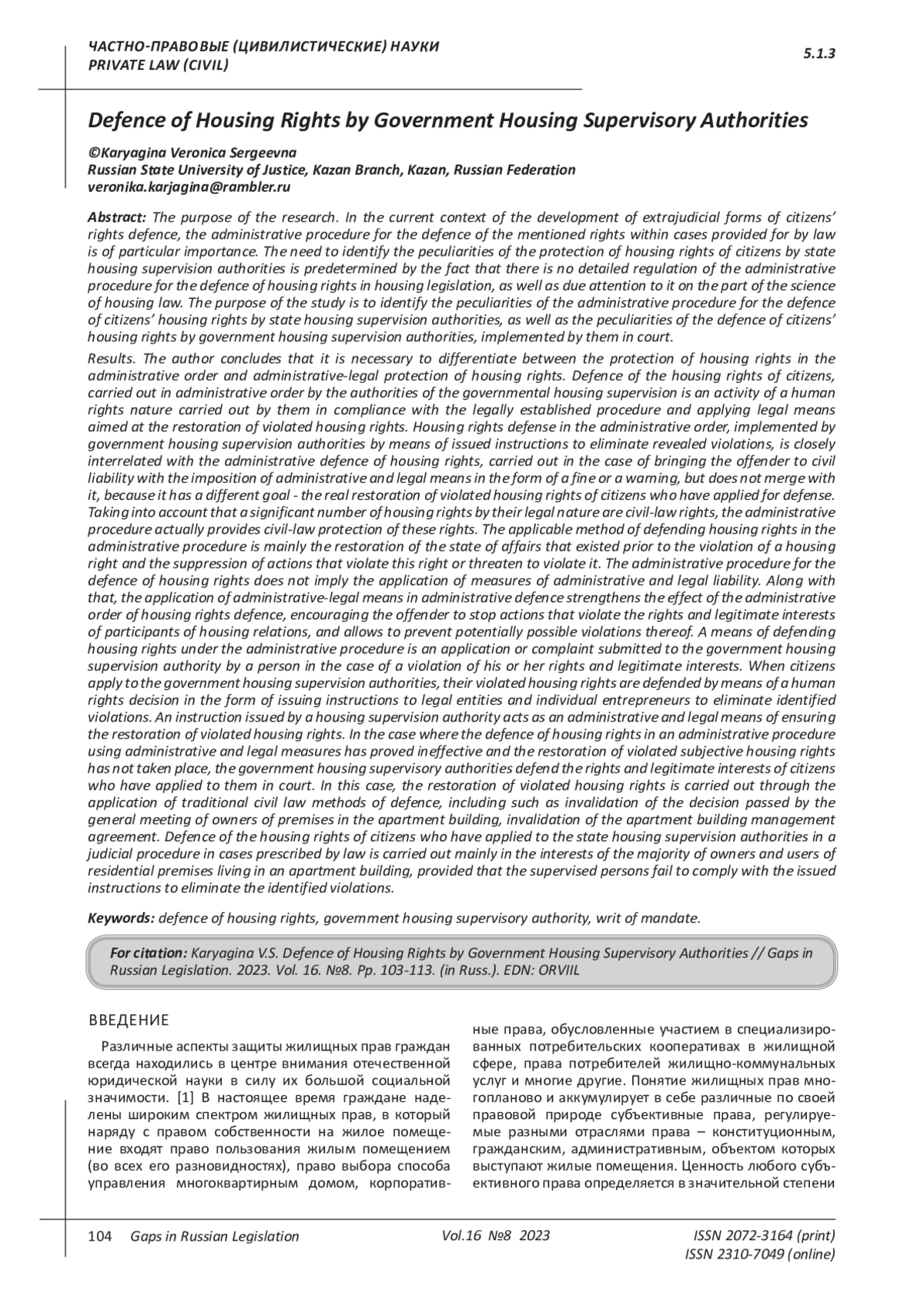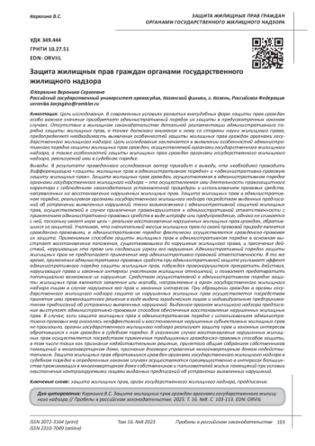 Статья: ЗАЩИТА ЖИЛИЩНЫХ ПРАВ ГРАЖДАН ОРГАНАМИ ГОСУДАРСТВЕННОГО ЖИЛИЩНОГО НАДЗОРА (2023)