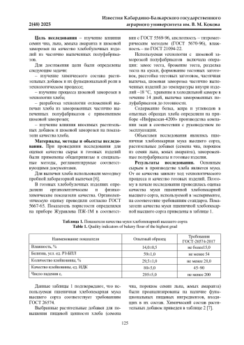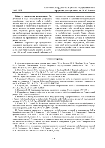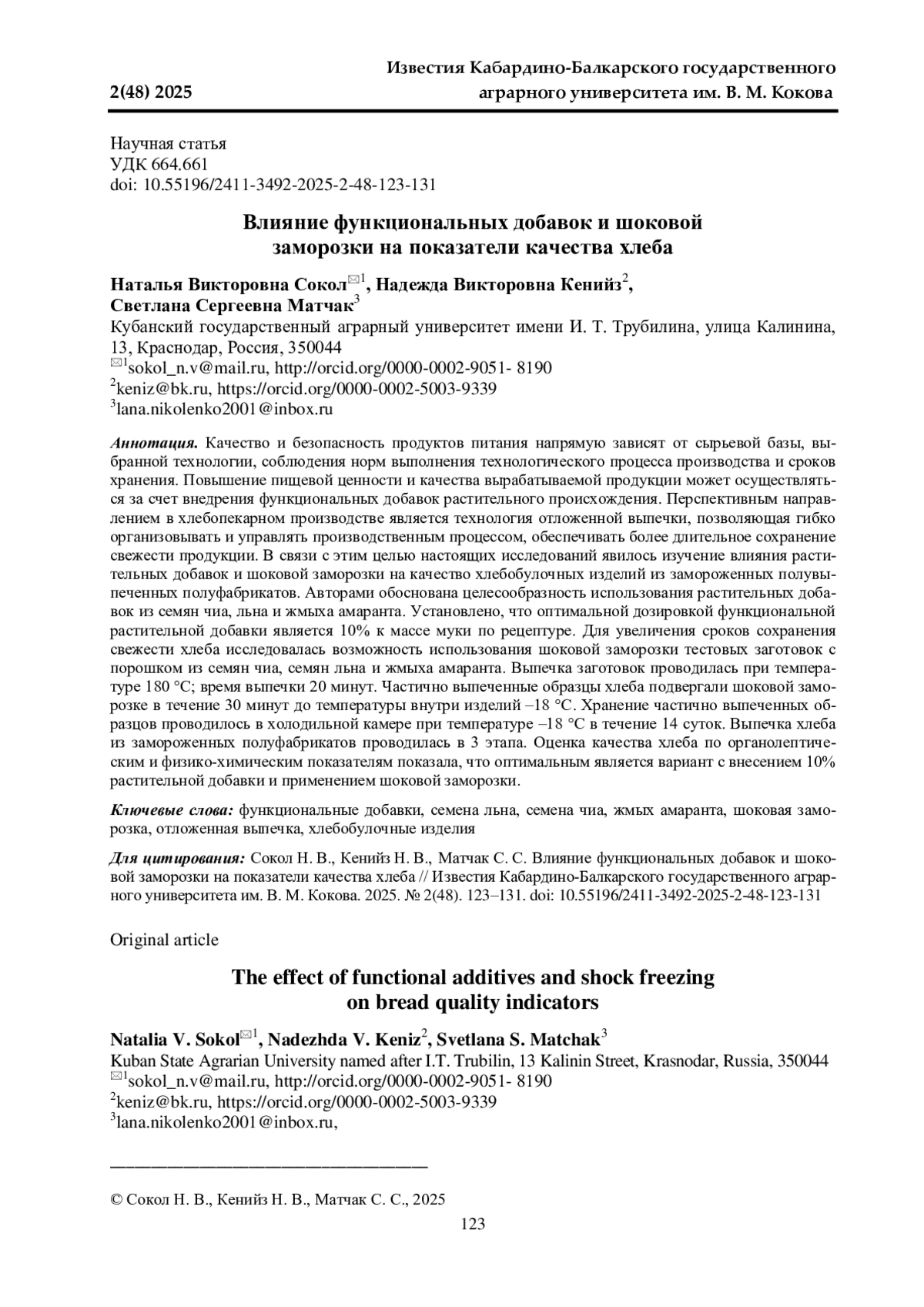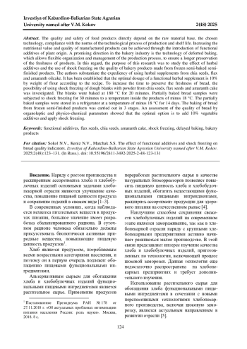 СОКОЛ Н. В., КЕНИЙЗ Н. В., МАТЧАК С. С. ВЛИЯНИЕ ФУНКЦИОНАЛЬНЫХ ДОБАВОК И ШОКОВОЙ ЗАМОРОЗКИ НА ПОКАЗАТЕЛИ КАЧЕСТВА ХЛЕБА // ИЗВЕСТИЯ КАБАРДИНО-БАЛКАРСКОГО ГОСУДАРСТВЕННОГО АГРАРНОГО УНИВЕРСИТЕТА ИМ. В. М. КОКОВА. 2025. № 2 (48)