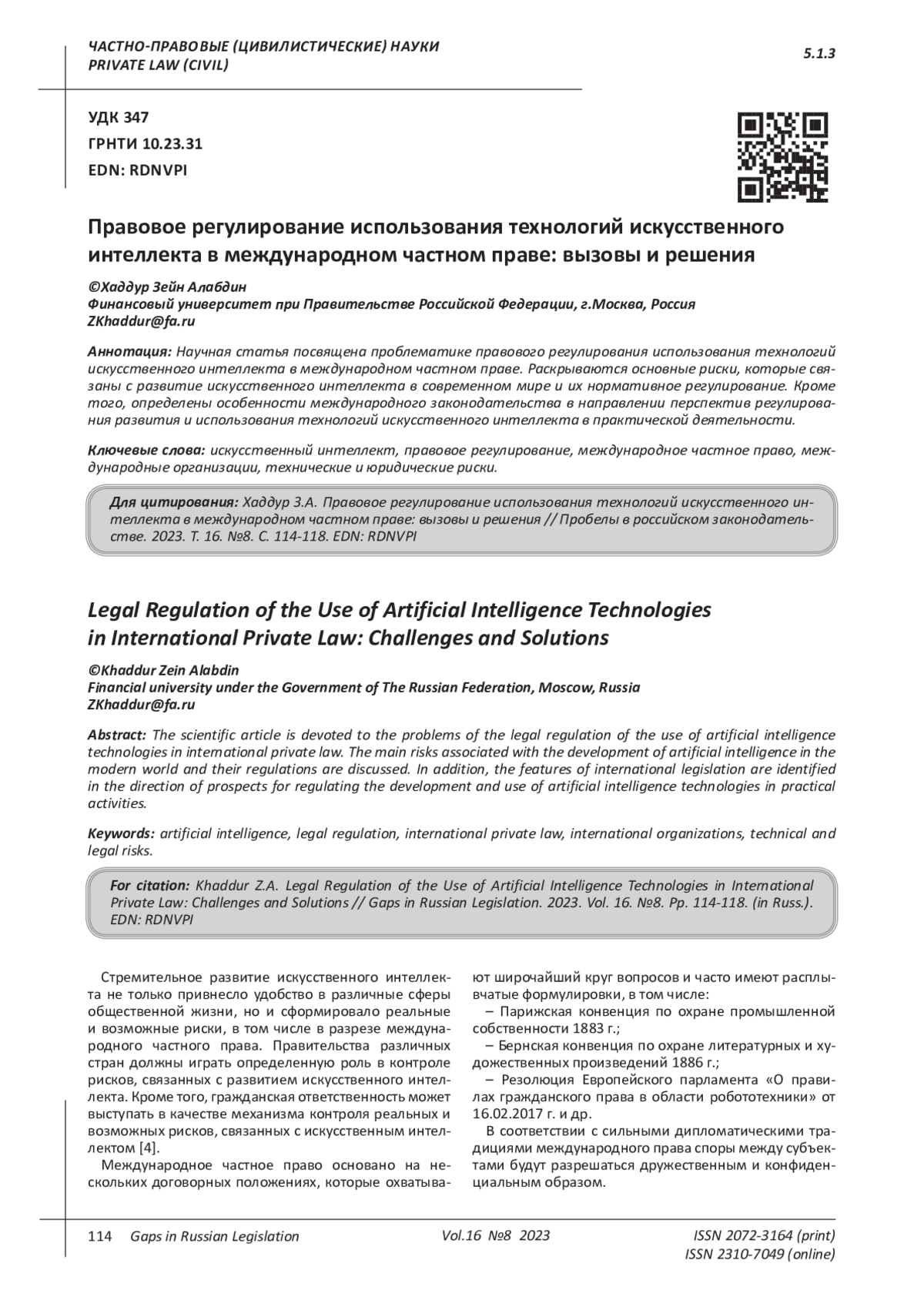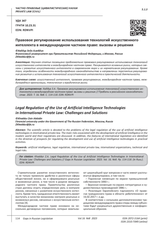 ХАДДУР З. А. ПРАВОВОЕ РЕГУЛИРОВАНИЕ ИСПОЛЬЗОВАНИЯ ТЕХНОЛОГИЙ ИСКУССТВЕННОГО ИНТЕЛЛЕКТА В МЕЖДУНАРОДНОМ ЧАСТНОМ ПРАВЕ: ВЫЗОВЫ И РЕШЕНИЯ // ПРОБЕЛЫ В РОССИЙСКОМ ЗАКОНОДАТЕЛЬСТВЕ. 2023. Т. 16 № 8 (36 СТ.)