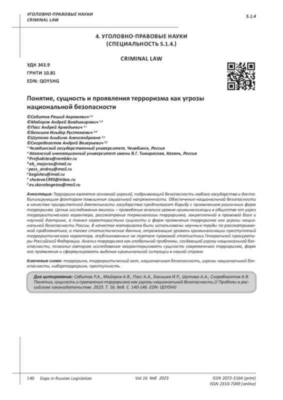 13. Сабитов Р.А., Сабитов Т.Р. Противодействие экстремизму и терроризму: уголовно-правовой и криминологический аспекты: Научно-практическое пособие. -Москва: Изд-во “Юрлитинформ”, 2023. 288 с. EDN: SRSLJK