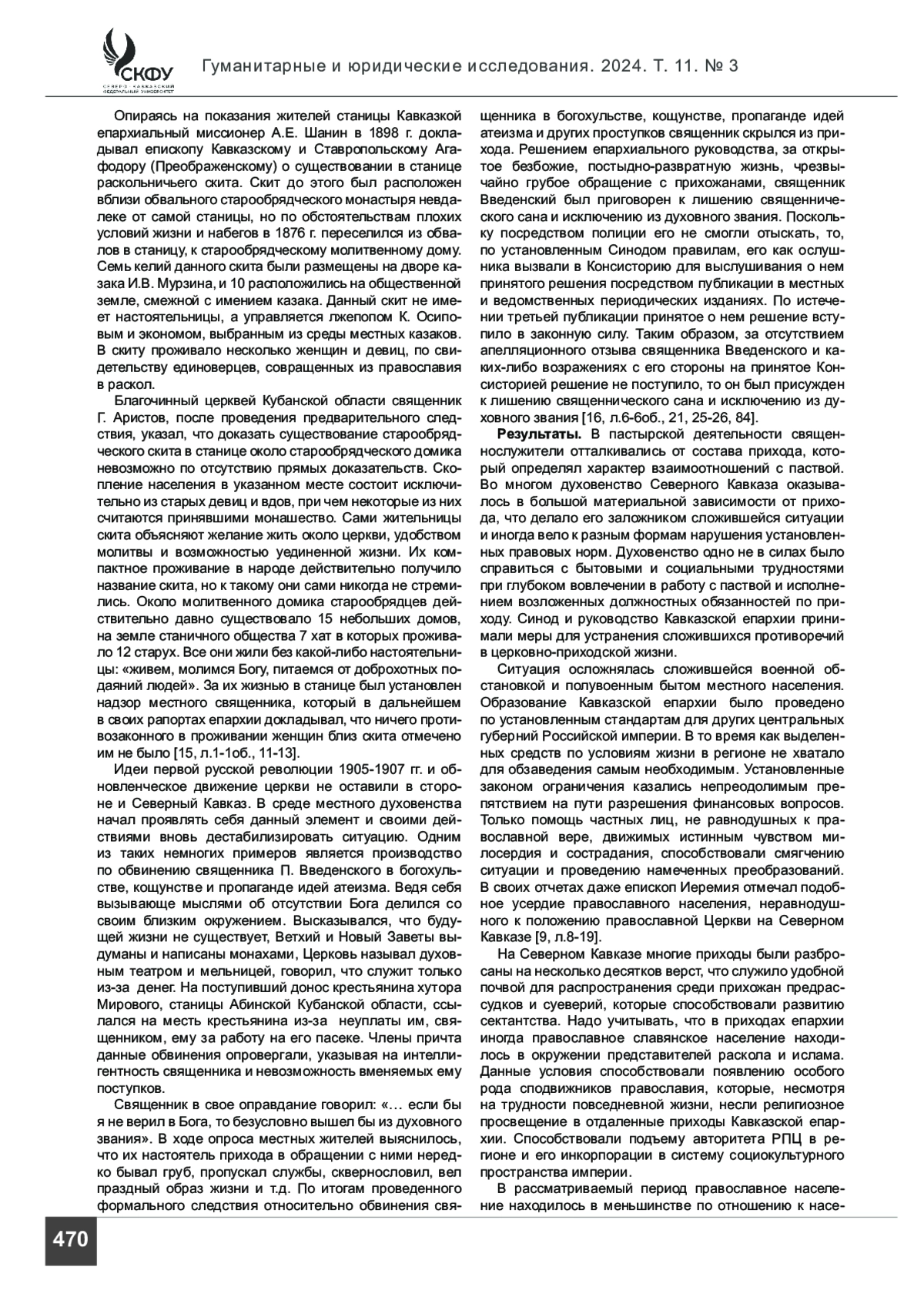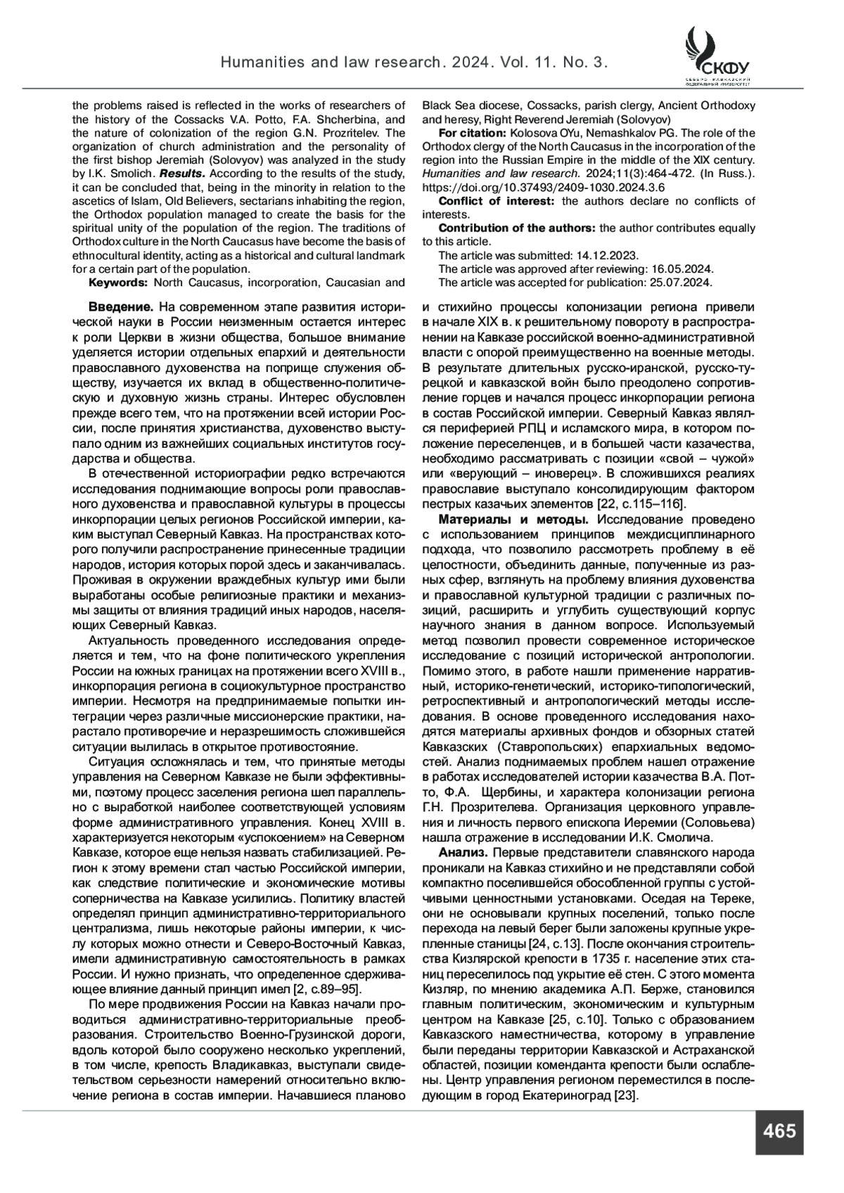 Материалы и методы. Основным подходом исследования стала междисциплинарность, которая предполагает конструирование целостного научного знания о влиянии духовенства и православия на инкорпорацию региона в состав России. Историческая антропология дала возможность увидеть изучаемую проблему через судьбы и биографии отдельных исторических фигурантов. Помимо этого, в работе нашли применение традиционные методы исторического исследования: историко-генетический, историко-типологический, ретроспективный. В основе проведенного исследования находятся материалы архивных фондов и обзорных статей Кавказских (Ставропольских) епархиальных ведомостей. Историография проблемы представлена работами В. А. Потто, Ф. А. Щербины, Г. Н. Прозрителева. И. К. Смолич исследовал организацию церковного управления и личность первого епископа Иеремии (Соловьева).