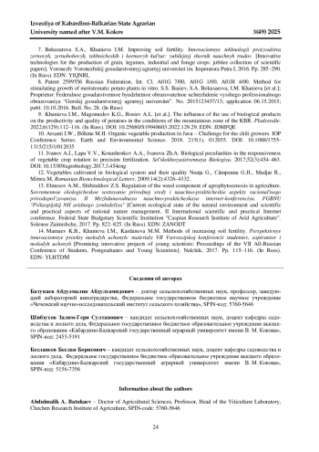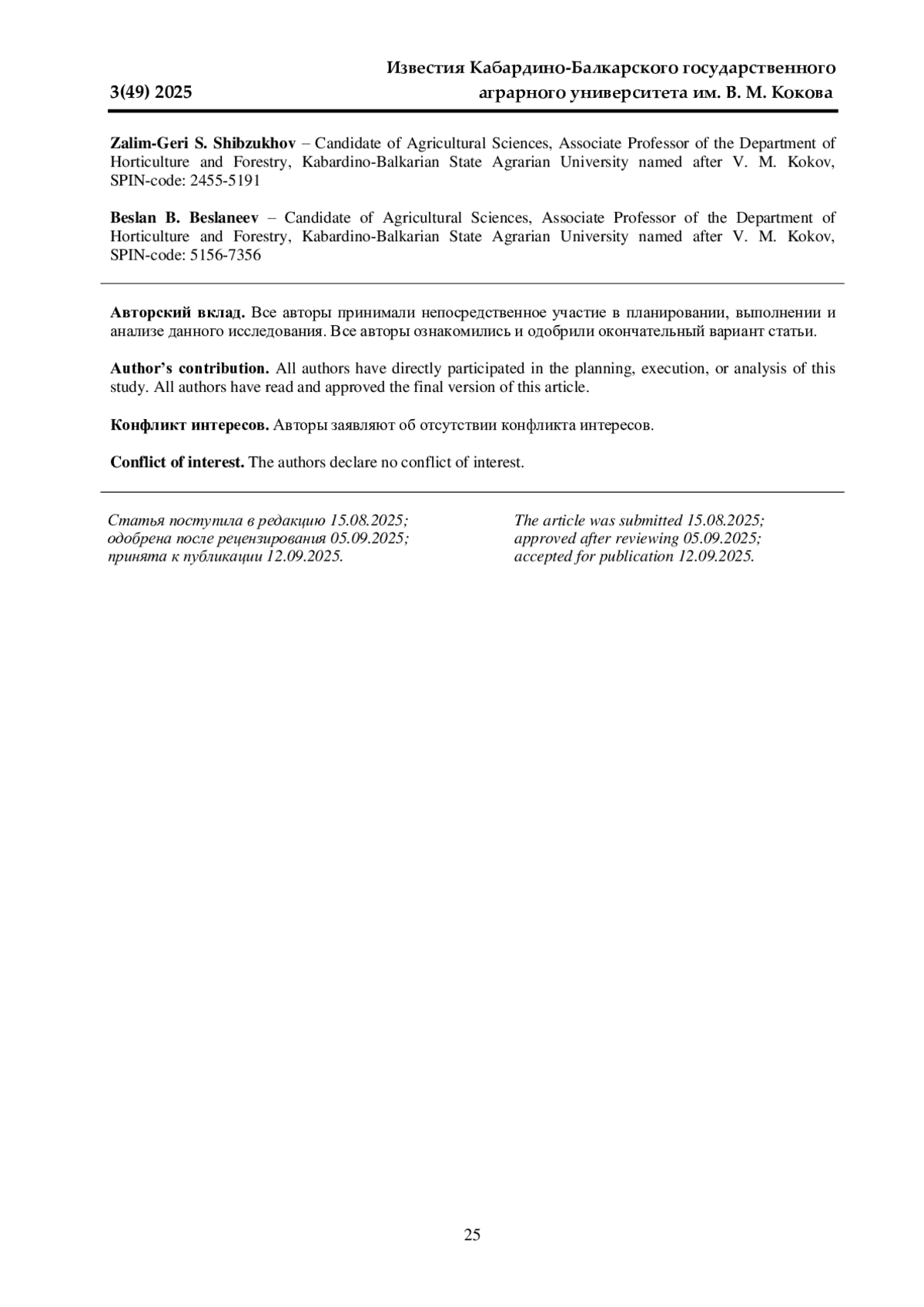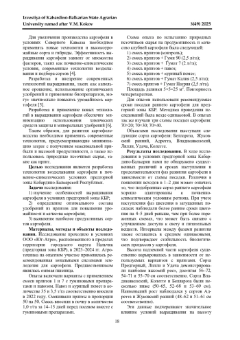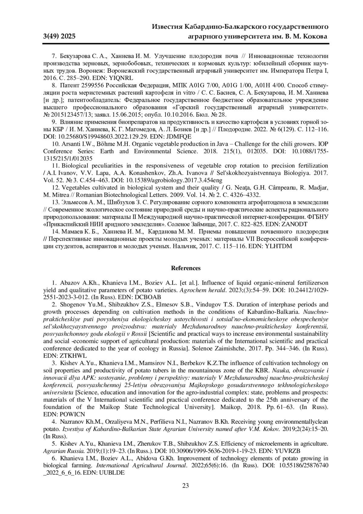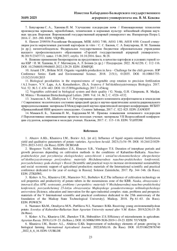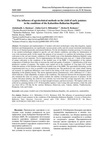 Статья: ВЛИЯНИЕ АГРОТЕХНИЧЕСКИХ ПРИЕМОВ НА УРОЖАЙНОСТЬ РАННЕГО КАРТОФЕЛЯ В УСЛОВИЯХ КАБАРДИНО-БАЛКАРСКОЙ РЕСПУБЛИКИ (2025)