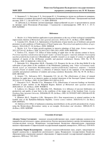 В статье приведены результаты исследования, проведенного в 2023-2024 гг. на территории учебного сада Ставропольского государственного аграрного университета. Объектами исследования являлись осенние сорта груши Талгарская Красавица и Ксения. Предметом исследования были некорневые подкормки - удобрения, содержащие микроэлементы. Согласно разработанной схеме опыта изучалась эффективность фолиарного внесения удобрений Стимул (3 л/га), Аквамикс, Л (2 л/га) и GO DRIP MICRO (1 кг/га) в сравнении с контролем без удобрений. В рамках проводимого исследования анализировалось воздействие удобрений на среднюю массу плодов, урожайность и концентрацию растворимых сухих веществ в плодах изучаемых сортов груши. Согласно полученным результатам, удобрения обеспечивали достоверное преимущество по всем анализируемым показателям относительно контрольных вариантов. Сравнительная оценка изучаемых сортов груши показала, что наиболее высокая средняя масса плодов отмечалась у сорта Ксения (183 г), а наибольшие урожайность и концентрация сухих веществ были в плодах сорта Талгарская Красавица с достоверным превышением показателей второго сорта. Самые высокие показатели по всем анализируемым параметрам были получены на фоне применения удобрения GO DRIP MICRO. Преимущество данного варианта относительно остальных в средней массе плодов составило 15-66 г, в урожайности 1,2-6,9 т/га, концентрации растворимых сухих веществ 0,4-2,2%. При этом необходимо отметить, что по большинству рассматриваемых показателей удобрение Аквамикс, Л, несмотря на достоверное преимущество относительно вариантов контроля и удобрения Стимул, несущественно уступало лидирующему варианту.