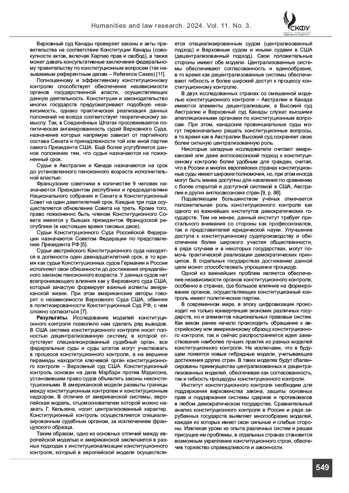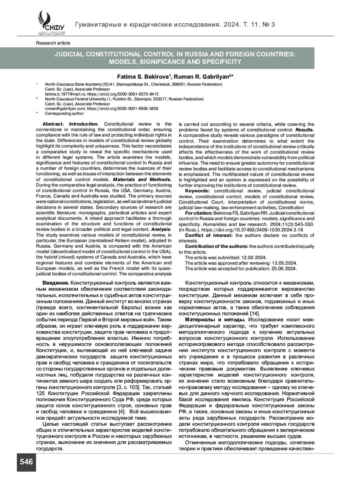 Результаты. Сравнительное исследование выявляет различные парадигмы конституционного контроля, рассмотрев которые определяется, в какой степени независимость институтов конституционного контроля критически влияет на эффективность работы органов конституционного контроля, какие модели демонстрируют уязвимость от политического влияния; подчеркивается необходимость обеспечения большей автономии органов конституционного контроля и облегчения доступа к конституционным механизмам; освещается многогранный характер конституционного контроля и высказывается мнение о возможности дальнейшего совершенствования институтов конституционного контроля.