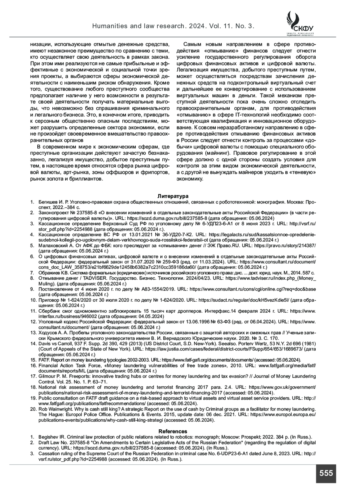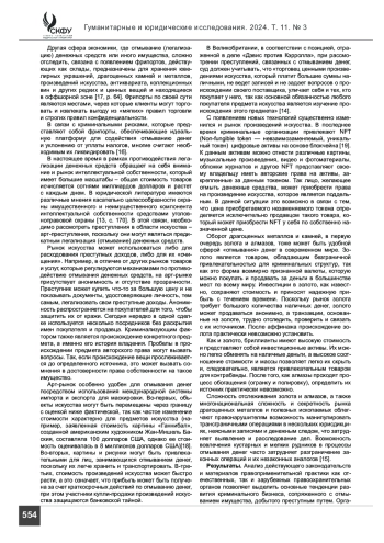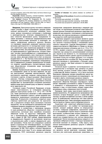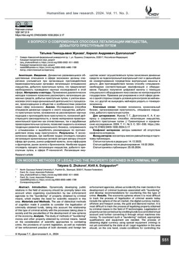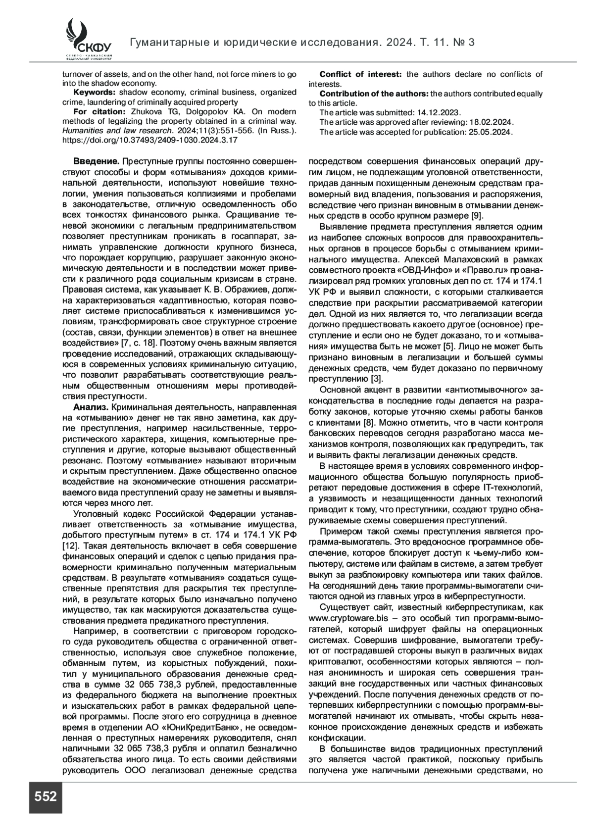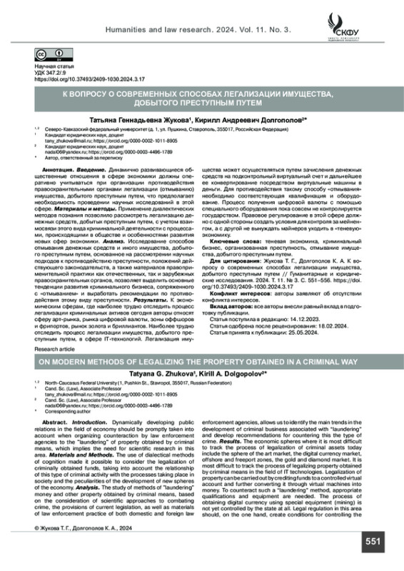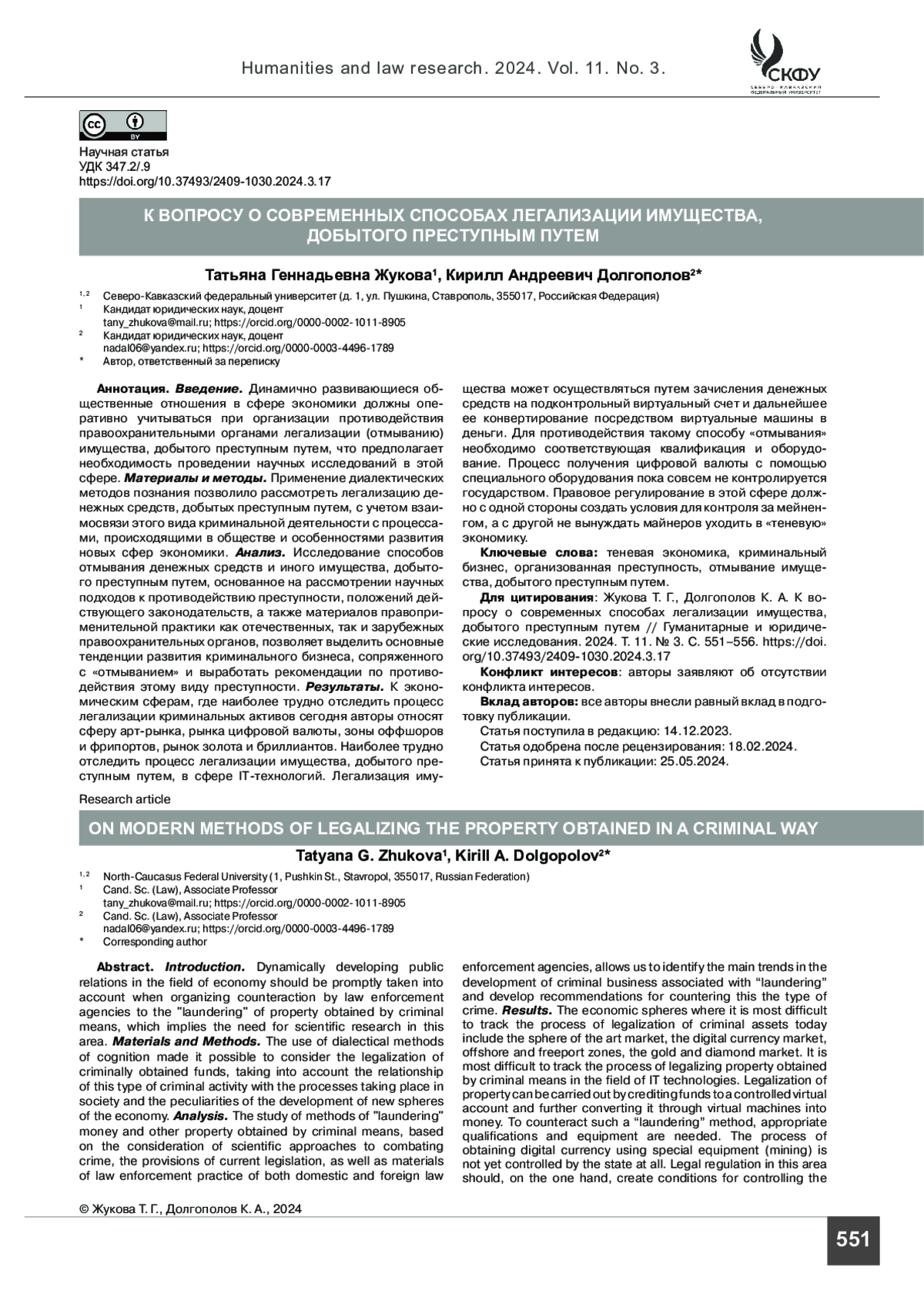 ЖУКОВА Т. Г., ДОЛГОПОЛОВ К. А. К ВОПРОСУ О СОВРЕМЕННЫХ СПОСОБАХ ЛЕГАЛИЗАЦИИ ИМУЩЕСТВА, ДОБЫТОГО ПРЕСТУПНЫМ ПУТЕМ // ГУМАНИТАРНЫЕ И ЮРИДИЧЕСКИЕ ИССЛЕДОВАНИЯ. 2024. ТОМ 11, № 3