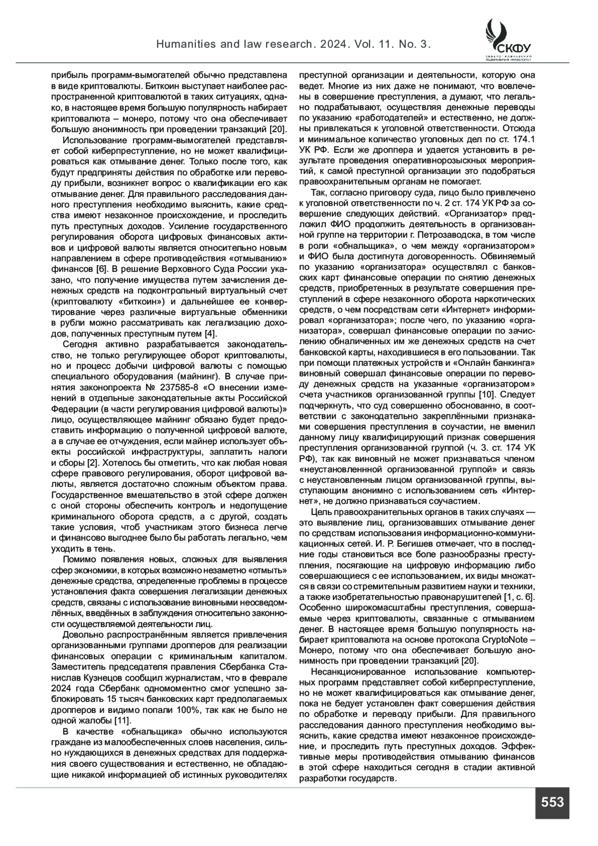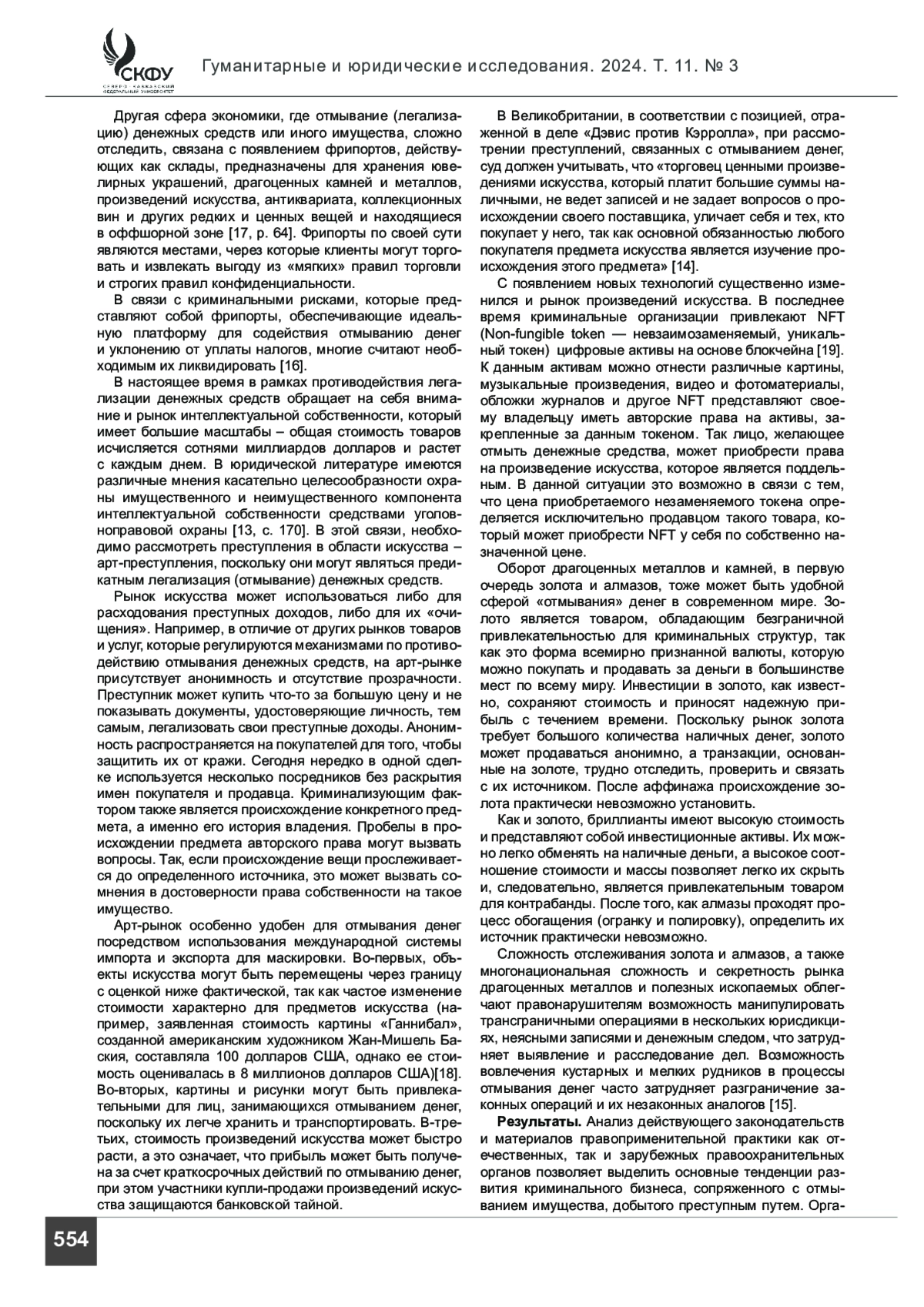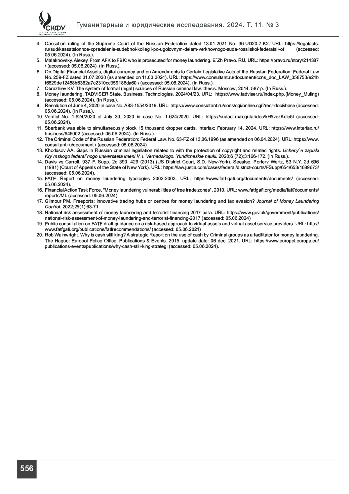 ЖУКОВА Т. Г., ДОЛГОПОЛОВ К. А. К ВОПРОСУ О СОВРЕМЕННЫХ СПОСОБАХ ЛЕГАЛИЗАЦИИ ИМУЩЕСТВА, ДОБЫТОГО ПРЕСТУПНЫМ ПУТЕМ // ГУМАНИТАРНЫЕ И ЮРИДИЧЕСКИЕ ИССЛЕДОВАНИЯ. 2024. ТОМ 11, № 3