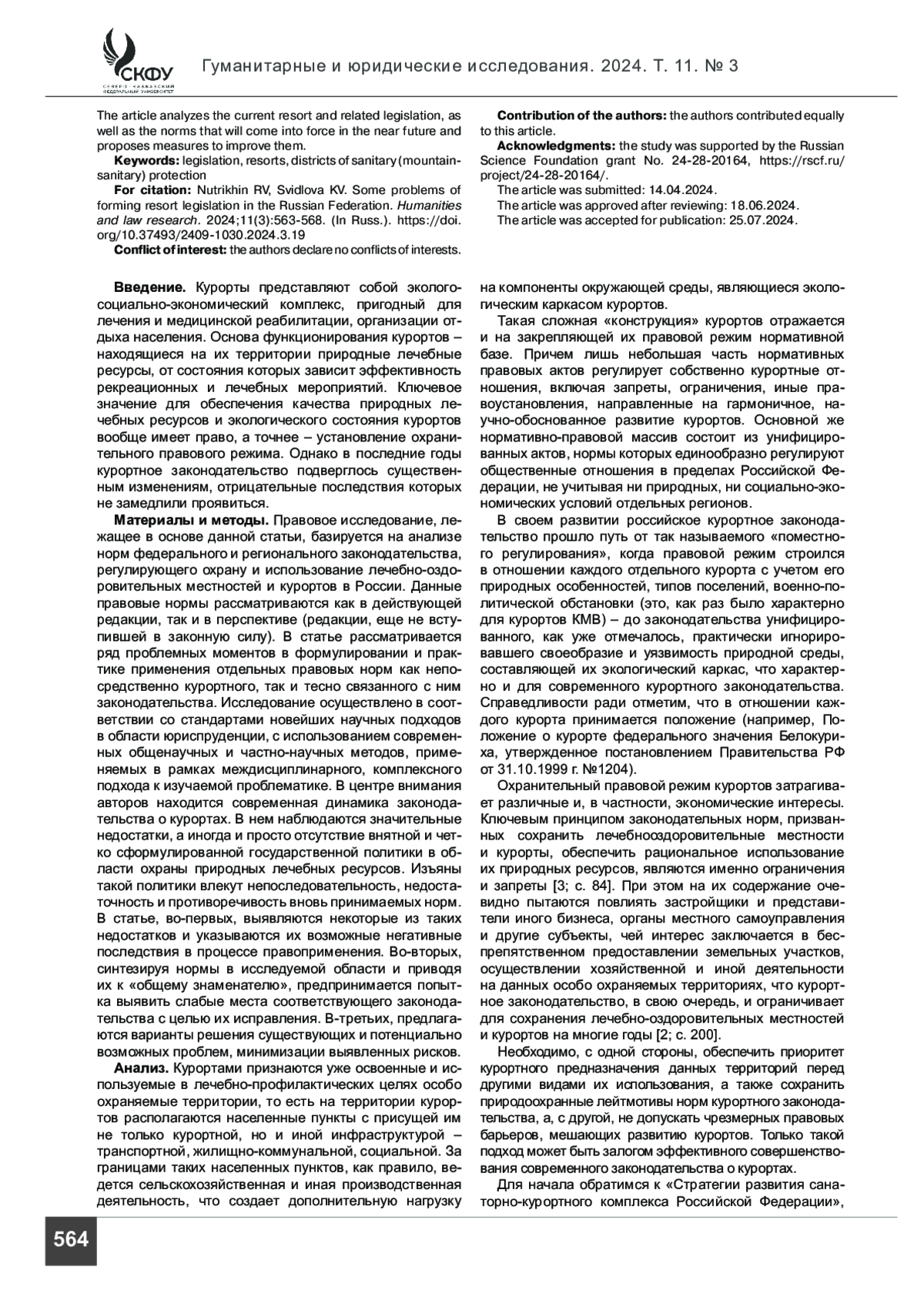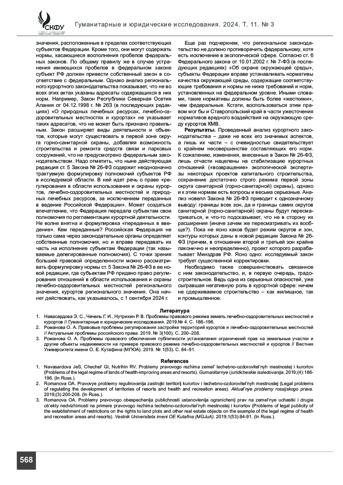 1. Навасардова Э. С., Чечель Г. И., Нутрихин Р. В. Проблемы правового режима земель лечебно-оздоровительных местностей и курортов // Гуманитарные и юридические исследования. 2019.№ 4. С. 186-196.