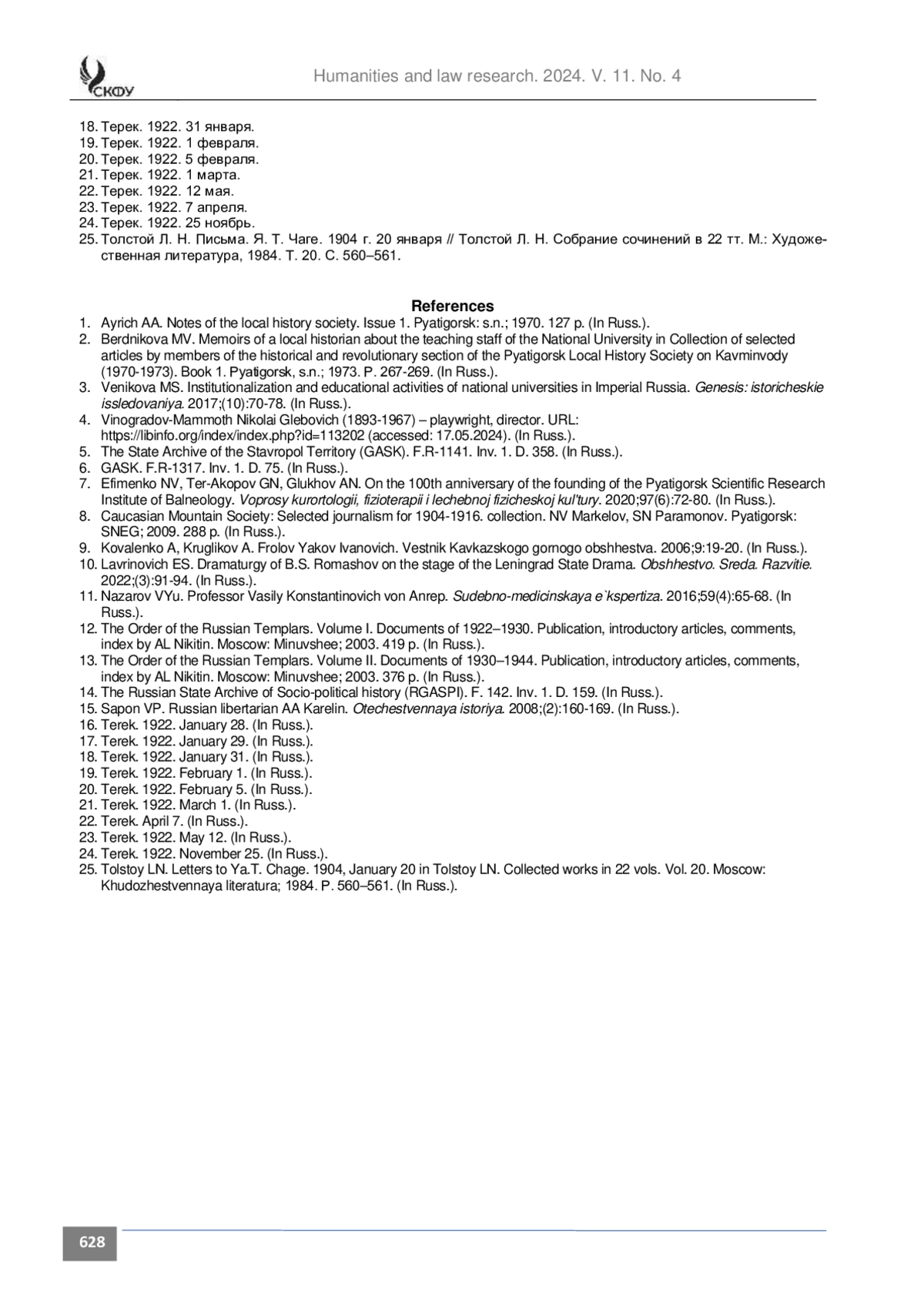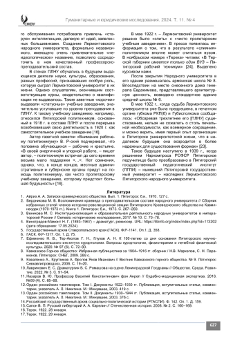 Введение. Представленная статья посвящена актуальной и малоизученной теме в региональной историографии – истории возникновения и деятельности Пятигорского Лермонтовского народного университета (ПЛНУ). Несмотря на важную административную, курортно-санаторную и культурную роль Пятигорска в Северо-Кавказском регионе, наличие значительного интеллектуального потенциала, здесь только весной 1918 г. был образован Пятигорский народный университет имени М. Ю. Лермонтова. Анализ. В статье рассматриваются два этапа в деятельности Лермонтовского университета: до занятия региона Вооруженными силами Юга России под командованием Деникина (май 1918 – январь 1919 г.) и после восстановления советской власти на Тереке весной 1920 г., когда возобновилась деятельность ПЛНУ (май 1920 – июнь 1922 г.). Основное внимание обращается на второй этап истории учебного заведения, когда его возглавляли известные в тот период деятели образования и культуры Н. И. Проферансов и Н. Г. Виноградов – люди, далекие от идей, провозглашенных большевиками. В стенах ПЛНУ обучались в будущем выдающиеся деятели науки, культуры, образования, разных профессий, признававшие особую роль, которую сыграл Лермонтовский университет в их жизни. По своему профессорско-преподавательскому составу ПЛНУ превосходил некоторые обычные вузы. Однако слушателям, окончившим соответствующие курсы, не выдавались документы об образовании.
