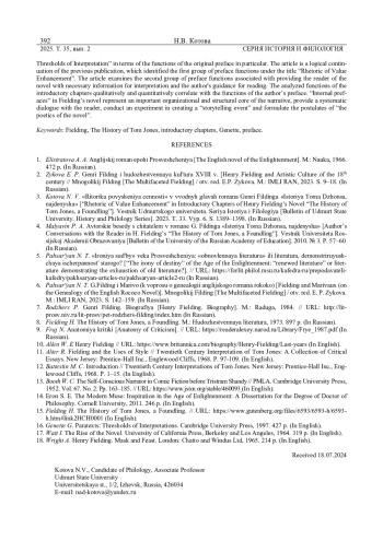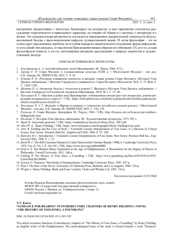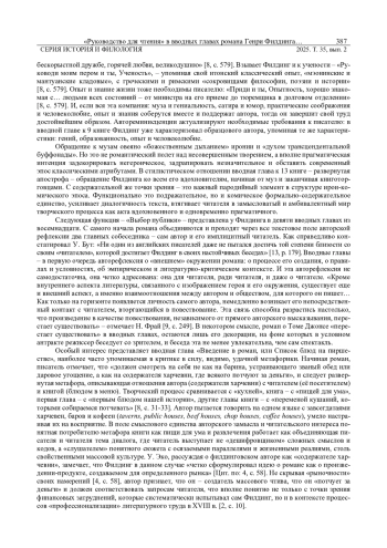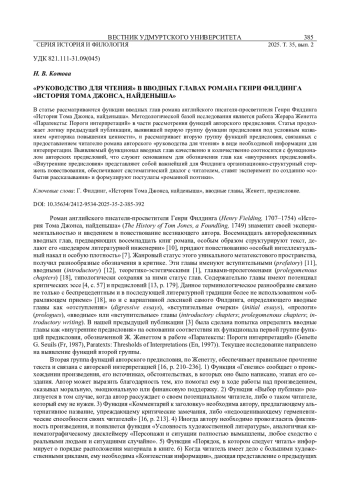 КОТОВА Н. В. «РУКОВОДСТВО ДЛЯ ЧТЕНИЯ» В ВВОДНЫХ ГЛАВАХ РОМАНА ГЕНРИ ФИЛДИНГА «ИСТОРИЯ ТОМА ДЖОНСА, НАЙДЕНЫША» // ВЕСТНИК УДМУРТСКОГО УНИВЕРСИТЕТА. СЕРИЯ: ИСТОРИЯ И ФИЛОЛОГИЯ. 2025. Т. 35 № 2