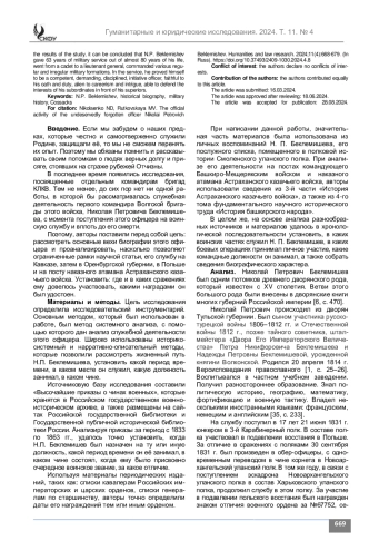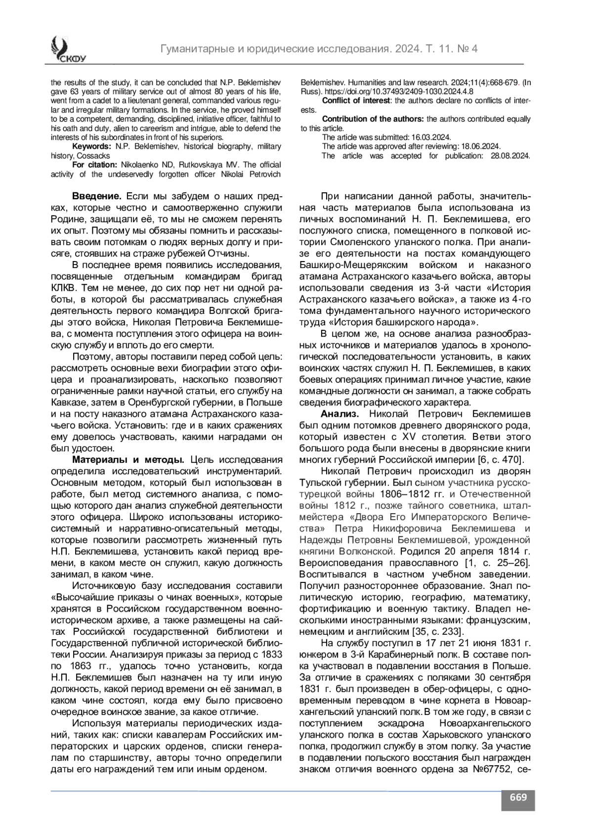 НИКОЛАЕНКО Н. Д., РУТКОВСКАЯ М. В. СЛУЖЕБНАЯ ДЕЯТЕЛЬНОСТЬ НЕЗАСЛУЖЕННО ЗАБЫТОГО ОФИЦЕРА НИКОЛАЯ ПЕТРОВИЧА БЕКЛЕМИШЕВА // ГУМАНИТАРНЫЕ И ЮРИДИЧЕСКИЕ ИССЛЕДОВАНИЯ. 2024. ТОМ 11, № 4
