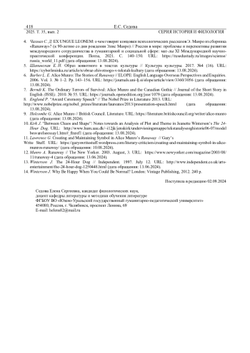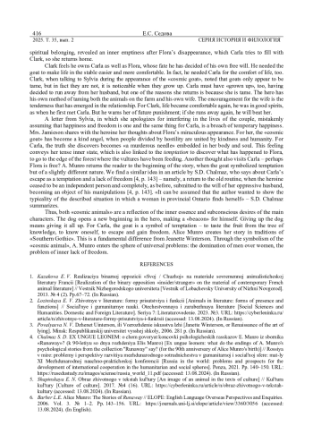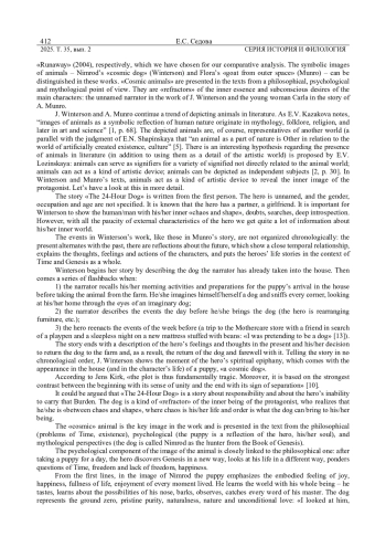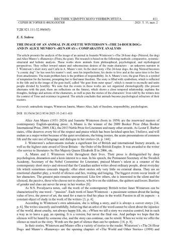 СЕДОВА Е. С. ОБРАЗ ЖИВОТНОГО В РАССКАЗАХ ДЖ. УИНТЕРСОН «ЩЕНОК НА СУТКИ» И Э. МАНРО «БЕГЛЯНКА»: ОПЫТ КОМПАРАТИВНОГО АНАЛИЗА // ВЕСТНИК УДМУРТСКОГО УНИВЕРСИТЕТА. СЕРИЯ: ИСТОРИЯ И ФИЛОЛОГИЯ. 2025. Т. 35 № 2