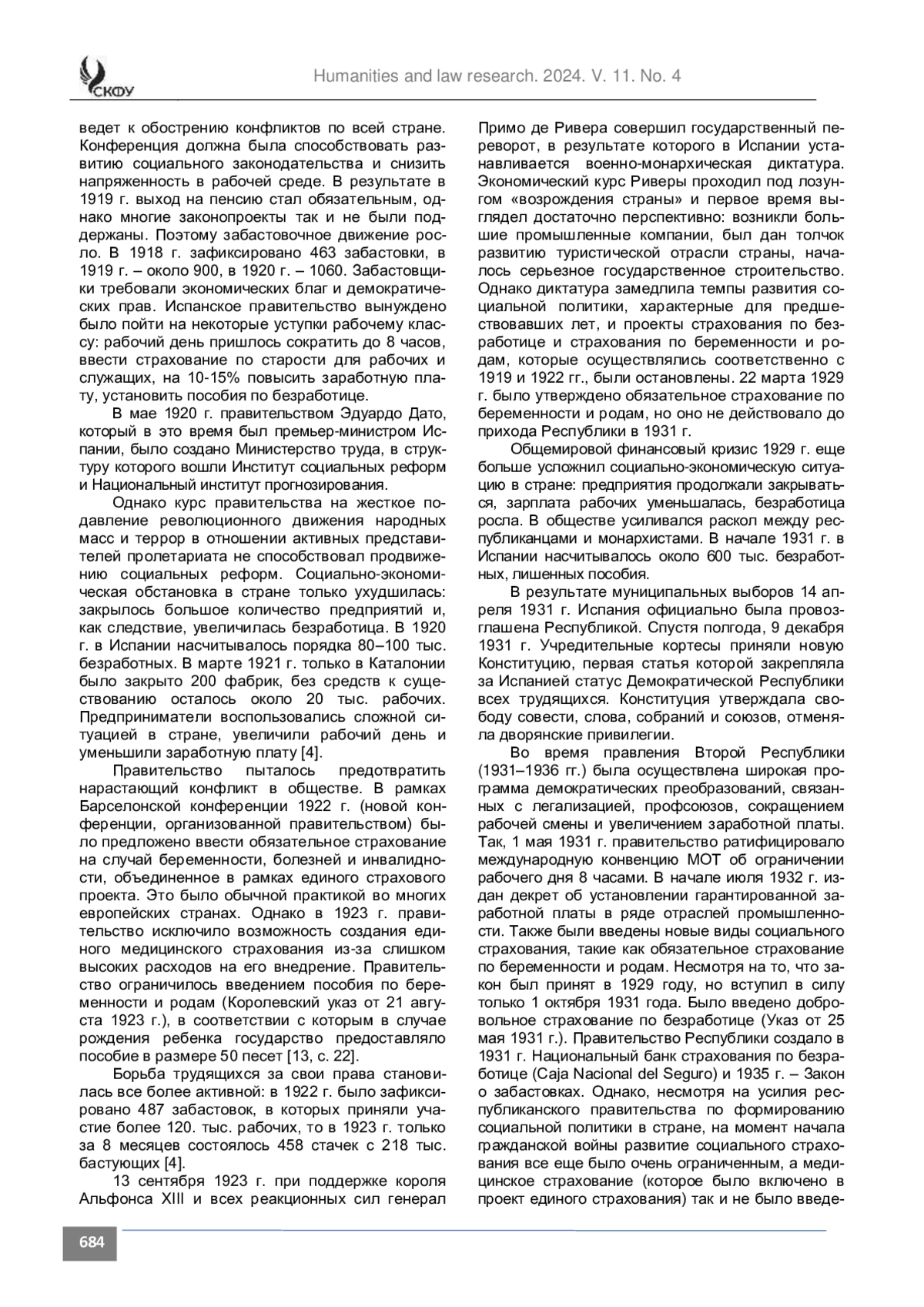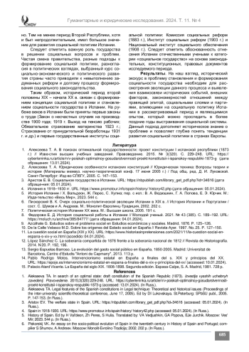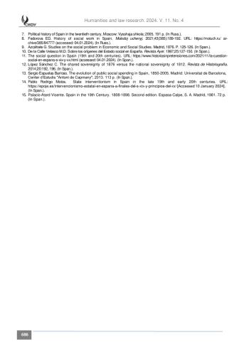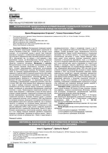 ОГАРКОВА И. В., РЫКУН Г. Н. ИСТОРИЧЕСКИЕ ПРЕДПОСЫЛКИ ФОРМИРОВАНИЯ СОЦИАЛЬНОЙ ПОЛИТИКИ В ИСПАНИИ В КОНЦЕ XIX-НАЧАЛЕ XX ВВ. // ГУМАНИТАРНЫЕ И ЮРИДИЧЕСКИЕ ИССЛЕДОВАНИЯ. 2024. ТОМ 11, № 4