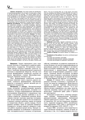 Введение. Исследование посвящено выявлению исторических предпосылок формирования социальной политики в Испании в конце XIX – начале XX вв. Авторы статьи полагают, что исторический подход к данной теме позволяет комплексно подходить к особенностям формирования социальной политики в современном мире. Изучение данной проблемы с XIX в. обусловлено тем, что именно с этого времени в таких европейских странах, как Великобритания, Франция, Германия вопросы становления социальной политики и ее важности в обществе становятся ключевыми.