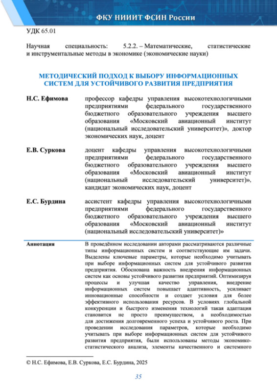 ЕФИМОВА Н. С., СУРКОВА Е. В., БУРДИНА Е. С. МЕТОДИЧЕСКИЙ ПОДХОД К ВЫБОРУ ИНФОРМАЦИОННЫХ СИСТЕМ ДЛЯ УСТОЙЧИВОГО РАЗВИТИЯ ПРЕДПРИЯТИЯ // ИНФОРМАЦИОННЫЕ ТЕХНОЛОГИИ В УИС. 2025. № 1