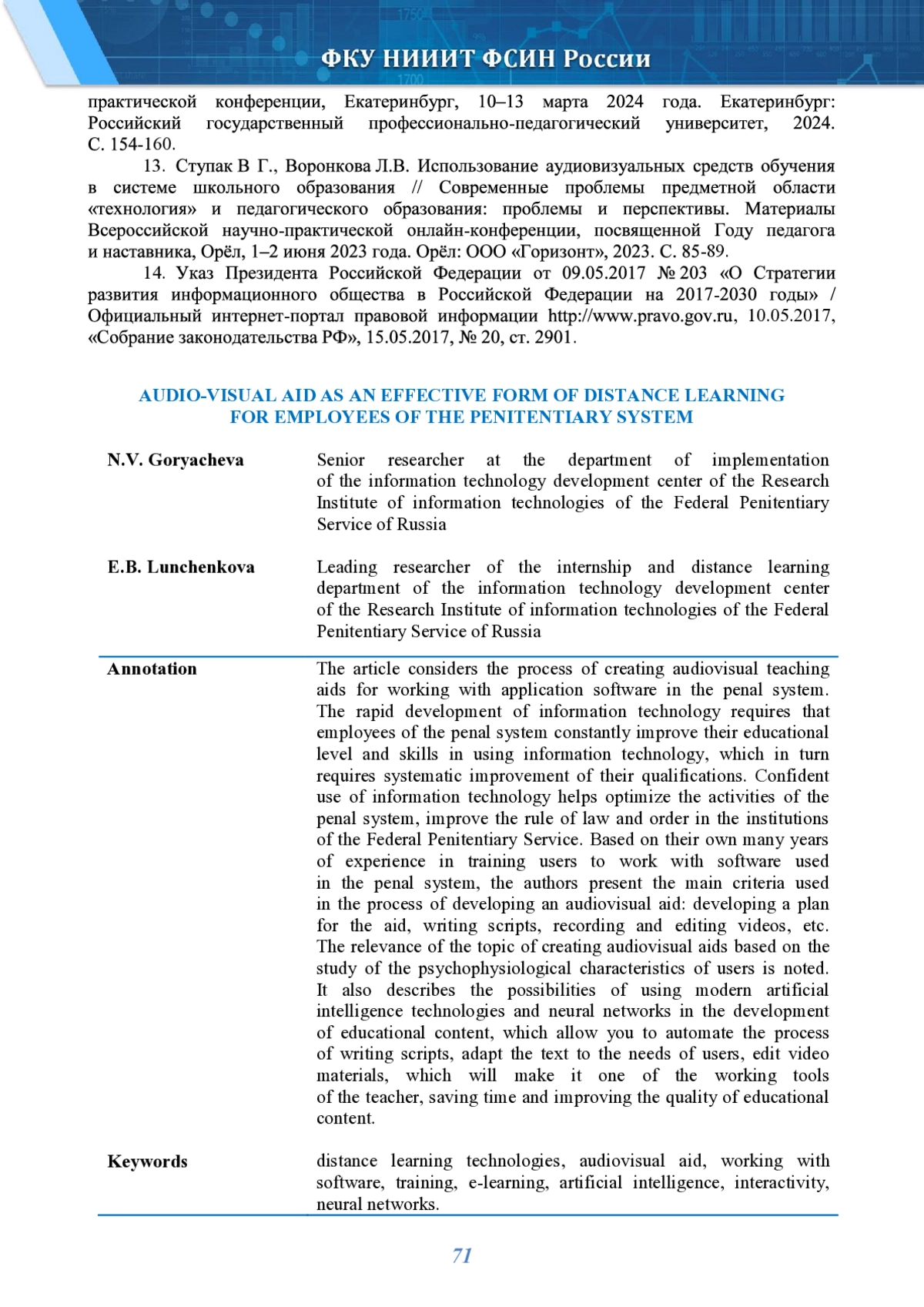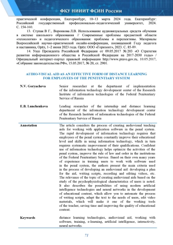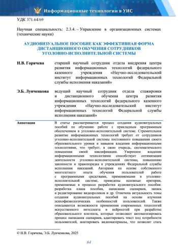ГОРЯЧЕВА Н. В., ЛУНЧЕНКОВА Э. Б. АУДИОВИЗУАЛЬНОЕ ПОСОБИЕ КАК ЭФФЕКТИВНАЯ ФОРМА ДИСТАНЦИОННОГО ОБУЧЕНИЯ СОТРУДНИКОВ УГОЛОВНО-ИСПОЛНИТЕЛЬНОЙ СИСТЕМЫ // ИНФОРМАЦИОННЫЕ ТЕХНОЛОГИИ В УИС. 2025. № 1