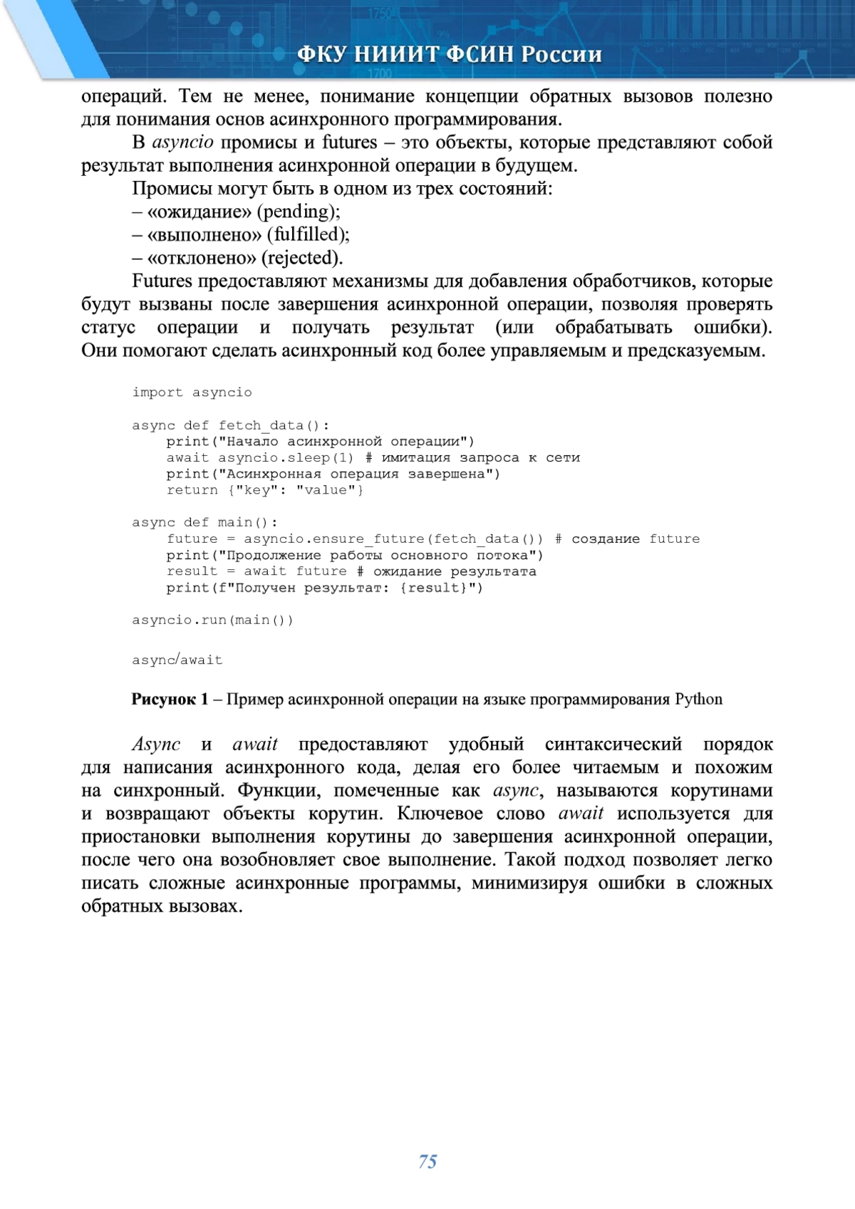 Статья посвящена основным принципам, применению и развитию асинхронного программирования на языке Python. Показано, что асинхронное программирование - это способ, позволяющий выполнять операции ввода-вывода и другие длительные процессы без блокировки основного потока выполнения программы. Описано, что указанный способ достигается за счет использования корутин, событийных циклов и других механизмов, позволяющих программе переключаться между разными задачами, что, в свою очередь, повышает эффективность использования ресурсов, снижает время ожидания и улучшает отзывчивость приложений, особенно в сценариях, связанных с большим количеством параллельных операций. В данной статье авторами подробно рассматриваются основные принципы асинхронного программирования на языке Python, его применение в различных сферах, включая взаимодействие с API, базами данных, возможности масштабируемости, а также перспективы развития данного подхода в будущем. Проведено сравнение асинхронного программирования с другими способами, такими, как синхронное программирование и многопоточность, показаны преимущества и недостатки каждого подхода. Приведены примеры ряда направлений разработки программных продуктов в ФСИН России, применение асинхронного программирования в которых позволит улучшить их эффективность, а также повысит качество разработанных программных средств и увеличит скорость обработки информации.