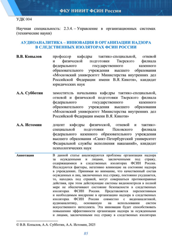 В данной статье анализируются проблемы организации надзора за осужденными и лицами, заключенными под стражу, содержащимися в следственных изоляторах ФСИН России. Исследуются факторы, негативно влияющие на состояние надзора в учреждениях. Принимая во внимание, что качественный состав осужденных и лиц, заключенных под стражу, постоянно ухудшается, то, находясь под стражей, могут совершаться противоправные действия, при этом действующие системы видеоконтроля в полной мере не обеспечивают состояние безопасности в следственных изоляторах ФСИН России. Представляется перспективным и необходимым внедрение в организацию надзора в следственных изоляторах ФСИН России совместно с видеоаналитикой, аудиоаналитику, основанную на использовании систем искусственного интеллекта. Эта инновация будет способствовать повышению эффективности организации надзора за осужденными и лицами, заключенными под стражу в следственных изоляторах ФСИН России. Внедрение в систему надзора следственных изоляторов ФСИН России аудиоаналитики, оснащенной технологиями искусственного интеллекта, даст возможность обеспечить автоматизированную обработку фактически всей голосовой и аудиовизуальной информации, поступающей от микрофонных и телефонных технических средств. Современная технологичная аудиоаналитика обеспечит анализ и контроль речевого поведения осужденных и лиц, заключенных под стражу, перевод разговоров и анализ их содержания, а также возможность анализировать звуки, происходящие в камере и на их основе получать максимально полную информацию о латентных процессах. Внедрение современной аудиоаналитики может быть положено в основу создания отечественной системы кибернадзора за осужденными и лицами, заключенными под стражу, содержащимися в следственных изоляторах ФСИН России и существенным образом повысить состояние безопасности сотрудников, осужденных и лиц, заключенных под стражу и других граждан.