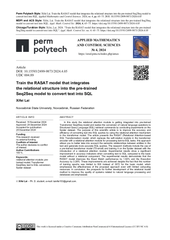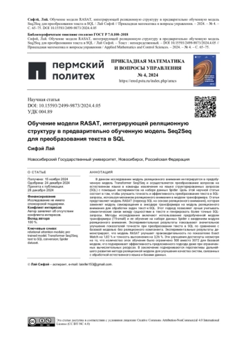 ЛАЙ С. TRAIN THE RASAT MODEL THAT INTEGRATES THE RELATIONAL STRUCTURE INTO THE PRE-TRAINED SEQ2SEQ MODEL TO CONVERT TEXT INTO SQL // ПРИКЛАДНАЯ МАТЕМАТИКА И ВОПРОСЫ УПРАВЛЕНИЯ. 2024. № 4