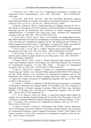 В данном исследовании модуль реляционного внимания интегрируется в предобученную модель Transformer Seq2Seq и осуществляется преобразование вопросов на естественном языке в команды извлечения на языке структурированных запросов (SQL) с помощью экспериментов на наборе данных Spider. Цель этой научной статьи состоит в том, чтобы улучшить точность и эффективность преобразования текста в SQLзапросы, используя механизм реляционного внимания в модели трансформера. Статья представляет модель RASAT (переход SQL на основе реляционного внимания), которая заменяет модуль самовращения в энкодере трансформера на модуль реляционного внимания для обработки задач текст-к-SQL. Этот подход позволяет лучше учитывать семантические связи между сущностями в тексте и генерировать более точные SQLзапросы. Методы исследования включают использование предобученной модели трансформера (T5-small) и ее обучение на наборе данных Spider с введением модуля реляционного внимания. Экспериментальные результаты показывают значительное улучшение показателей точности при преобразовании текста в SQL по сравнению с базовой моделью без реляционного компонента. Экспериментальные результаты демонстрируют, что модель RASAT улучшает производительность по показателю Exact Match на 1,82 % и точность выполнения на 3,26 %. Эти улучшения достигнуты несмотря на то, что количество эпох обучения было ограничено 500 вместо 3072 для базовой модели, что подчеркивает эффективность предложенного подхода даже при ограниченных вычислительных ресурсах. В заключение подчеркиваются перспективы дальнейшего развития метода реляционной модели для улучшения качества систем, связанных с обработкой естественного языка и базами данных.