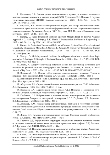 3. Использование теории нечетких множеств в экономическом анализе инвестиционных проектов / Р.А. Файзиев, У.Т. Хаитматов, О.Х. Азаматов, Ш.Р. Джуманиязов, Х.Х. Хасанова / International Journal of Innovative Technologies in Economy. - 2018. - Т. 2, № 5(17). - С. 44-48. DOI: 10.31435/rsglobal_ijite/01062018/5672 EDN: OUGRGL