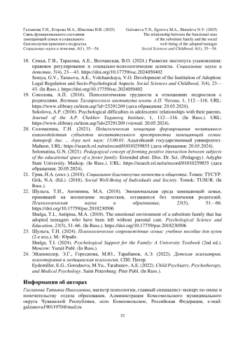 12. Махнач, А.В., Лактионова, А.И., Постылякова, Ю.В., Лотарева, Т.Ю. (2018). Жизнеспособность замещающей семьи: профилактика отказов от приемных детей. М.: Институт психологии РАН. EDN: YMGEST
