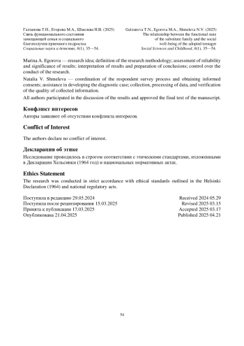 Контекст и актуальность. Функциональное состояние замещающей семьи оказывает значительное влияние на социальное благополучие приемного подростка. Исследование направлено на выявление взаимосвязи между этими аспектами, что важно для понимания процессов адаптации и интеграции приемных детей в новые семьи. Цель. Выявить связь между функциональным состоянием замещающей семьи и социальным благополучием приемного подростка. Гипотеза. Существует положительная корреляция между функциональным состоянием замещающей семьи и уровнем социального благополучия приемного подростка. Методы и материалы. В исследовании приняли участие 60 замещающих семей и 60 приемных детей подросткового возраста из различных районов Чувашской Республики. Использовались следующие методики: Опросник «Моя семья», Тест жизнестойкости, Опросник диспозиционного оптимизма, Опросник СОРЕ и «Технологическая карта оценки функционального состояния замещающей семьи». Эти инструменты позволили оценить взаимоотношения в семьях, методы воспитания, определить категорию риска функционального состояния замещающей семьи, исследовать семейные отношения и психологические характеристики подростков. Результаты. Эмпирическим путем была подтверждена гипотеза о существовании связи между функциональным состоянием замещающей семьи и социальным благополучием приемного подростка. Кроме того, были выявлены особенности этой связи в зависимости от пола подростков. Выводы. Результаты подчеркивают значимость поддержания гармоничного функционирования замещающих семей для обеспечения социального благополучия их воспитанников.