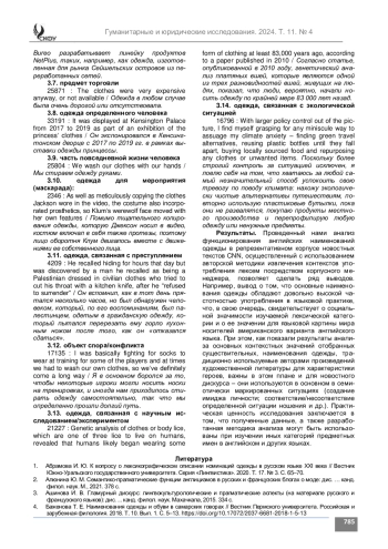 11. Исакова А. М. Семантика и функционирование лексем тематической группы «Одежда» // Социо- и психолингвистические исследования. 2021. Вып. 9. С. 86-93.