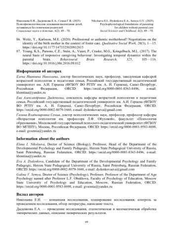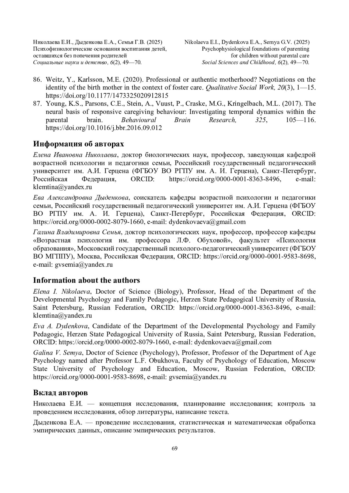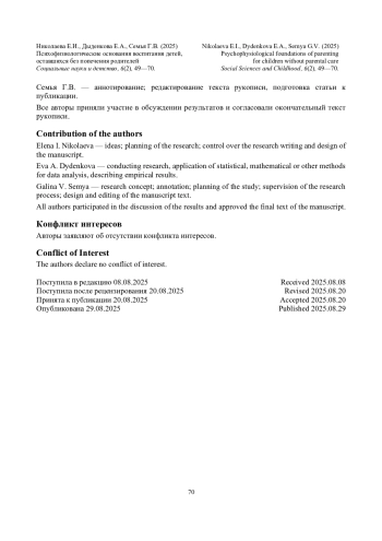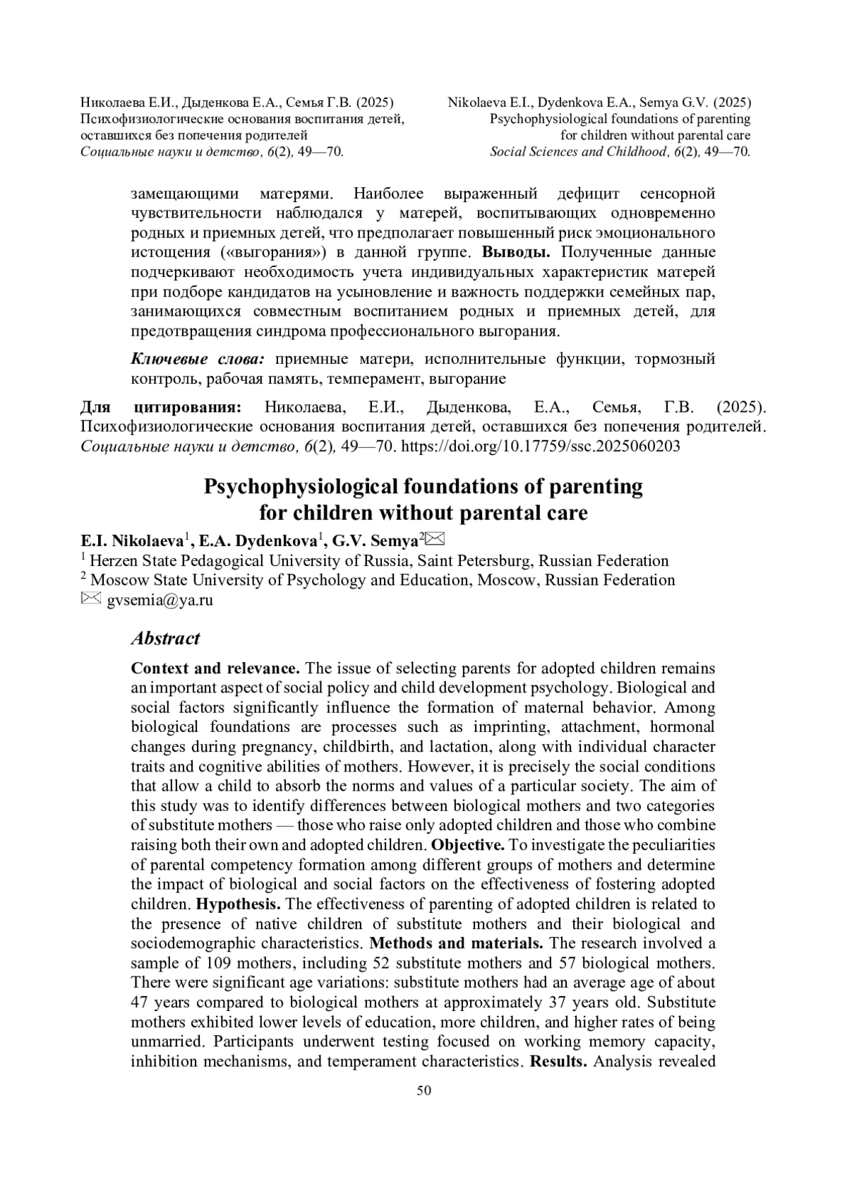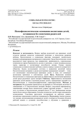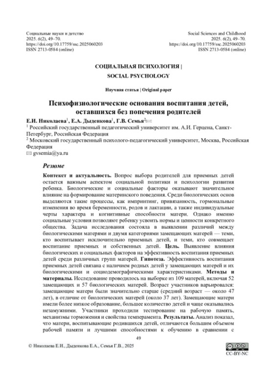 НИКОЛАЕВА Е. И., ДЫДЕНКОВА Е. А., СЕМЬЯ Г. В. ПСИХОФИЗИОЛОГИЧЕСКИЕ ОСНОВАНИЯ ВОСПИТАНИЯ ДЕТЕЙ, ОСТАВШИХСЯ БЕЗ ПОПЕЧЕНИЯ РОДИТЕЛЕЙ // СОЦИАЛЬНЫЕ НАУКИ И ДЕТСТВО. 2025. № 2, ТОМ 6