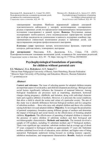Контекст и актуальность. Вопрос выбора родителей для приемных детей остается важным аспектом социальной политики и психологии развития ребенка. Биологические и социальные факторы оказывают значительное влияние на формирование материнского поведения. Среди биологических основ выделяются такие процессы, как импринтинг, привязанность, гормональные изменения во время беременности, родов и лактации, а также индивидуальные черты характера и когнитивные способности матери. Однако именно социальные условия позволяют ребенку усвоить нормы и ценности конкретного общества. Задача исследования состояла в выявлении различий между биологическими матерями и двумя категориями замещающих матерей — теми, кто воспитывает исключительно приемных детей, и теми, кто совмещает воспитание приемных и собственных детей. Цель. Выявление влияния биологических и социальных факторов на эффективность воспитания приемных детей среди различных групп матерей. Гипотеза. Эффективность воспитания приемных детей связана с наличием родных детей у замещающих матерей и их биологическими и социодемографическими характеристиками. Методы и материалы. Исследование проводилось на выборке из 109 матерей, включая 52 замещающих и 57 биологических матерей. Возраст участников варьировался: замещающие матери были значительно старше (средний возраст — около 47 лет), в отличие от биологических матерей (около 37 лет). Замещающие матери имели более низкое образование, большее количество детей и чаще оказывались незамужними. Участники проходили тестирование на рабочую память, механизмы торможения и свойства темперамента. Результаты. Анализ показал, что матери, воспитывающие родившихся детей, отличаются большим объемом рабочей памяти и лучшими способностями к обучению в сравнении с замещающими матерями. Наиболее выраженный дефицит сенсорной чувствительности наблюдался у матерей, воспитывающих одновременно родных и приемных детей, что предполагает повышенный риск эмоционального истощения («выгорания») в данной группе. Выводы. Полученные данные подчеркивают необходимость учета индивидуальных характеристик матерей при подборе кандидатов на усыновление и важность поддержки семейных пар, занимающихся совместным воспитанием родных и приемных детей, для предотвращения синдрома профессионального выгорания.