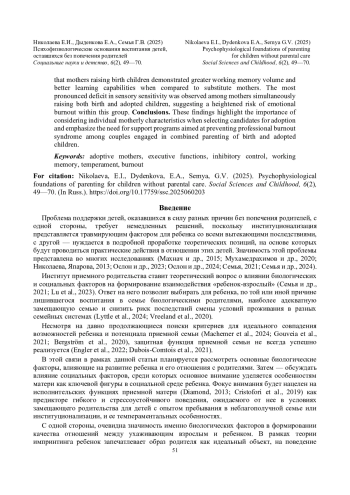 Ключевые фразы: приемные матери, исполнительные функции, тормозный контроль, рабочая память, ТЕМПЕРАМЕНТ, выгорание