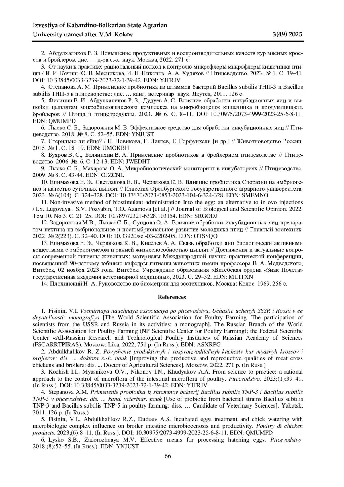 13. Епимахова Е. Э., Червякова К. В., Киселев А. А. Связь обработки яиц биологически активными веществами с эмбриогенезом и ранней жизнеспособностью цыплят // Достижения и актуальные вопросы современной гигиены животных: материалы Международной научно-практической конференции, посвященной 90-летнему юбилею кафедры гигиены животных имени профессора В. А. Медведского, Витебск, 02 ноября 2023 года. Витебск: Учреждение образования “Витебская ордена “Знак Почета” государственная академия ветеринарной медицины”, 2023. С. 29-32. EDN: MUITXN