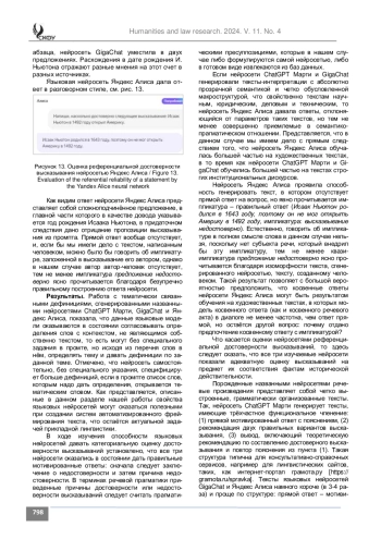 Результаты. Работа с тематически связанными дефинициями, сгенерированными названными нейросетями, позволила установить, что данные языковые модели в состоянии согласовывать определения слов с контекстом, не являющимся собственно текстом, то есть могут без специального задания в промте, но исходя из перечня слов в нём, определять тему и давать дефиниции по этой теме. В ходе изучения способности языковых нейросетей давать оценку категориальной и референциальной достоверности высказываний установлено, что все три нейросети оказались в состоянии дать правильные мотивированные ответы, за одним исключением, когда нейросеть указала нехватку информации. В ходе изучения текстов, сгенерированных названными языковыми нейросетями, были выявлены пять основных типов нарушений (дефектов) в них, которые могут квалифицироваться как типичные для этих нейросетей: 1) нарушения логико-семантических связей в тексте, выполнение ложных семантических операций; 2) нарушения бытийных прагматических пресуппозиций (знания о мире, о свойствах предметов); 3) нарушения коммуникативно-прагматических правил речевого поведения; 4) грамматические отклонения в управлении и согласовании; 5) макроструктурные нарушения.