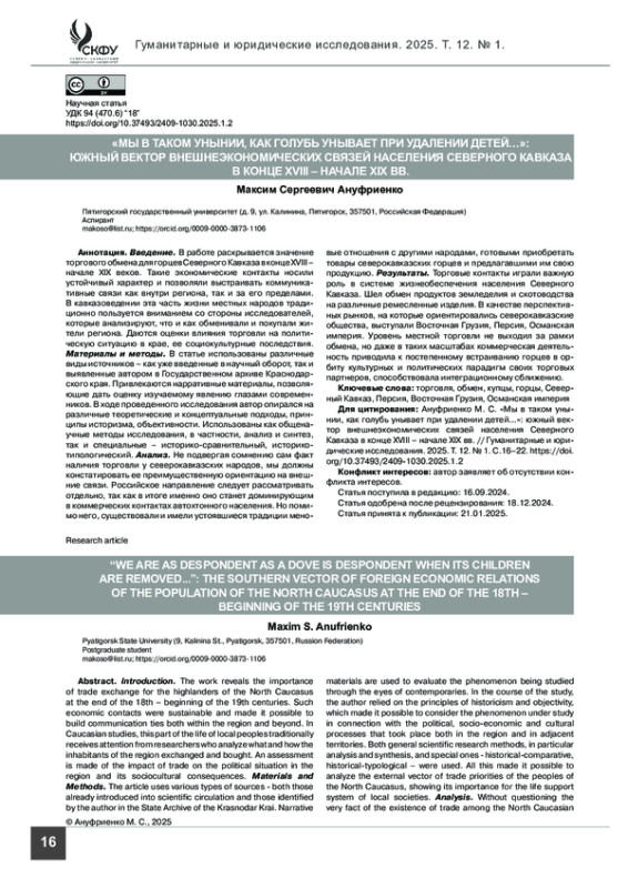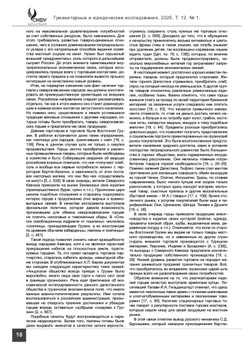 Введение. В работе раскрывается значение торговогообменадлягорцев Северного Кавказавконце XVIII– начале XIX веков. Такие экономические контакты носили устойчивый характер и позволяли выстраивать коммуникативные связи как внутри региона, так и за его пределами. В кавказоведении эта часть жизни местных народов традиционно пользуется вниманием со стороны исследователей, которые анализируют, что и как обменивали и покупали жители региона. Даются оценки влияния торговли на политическую ситуацию в крае, ее социокультурные последствия.
