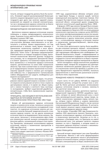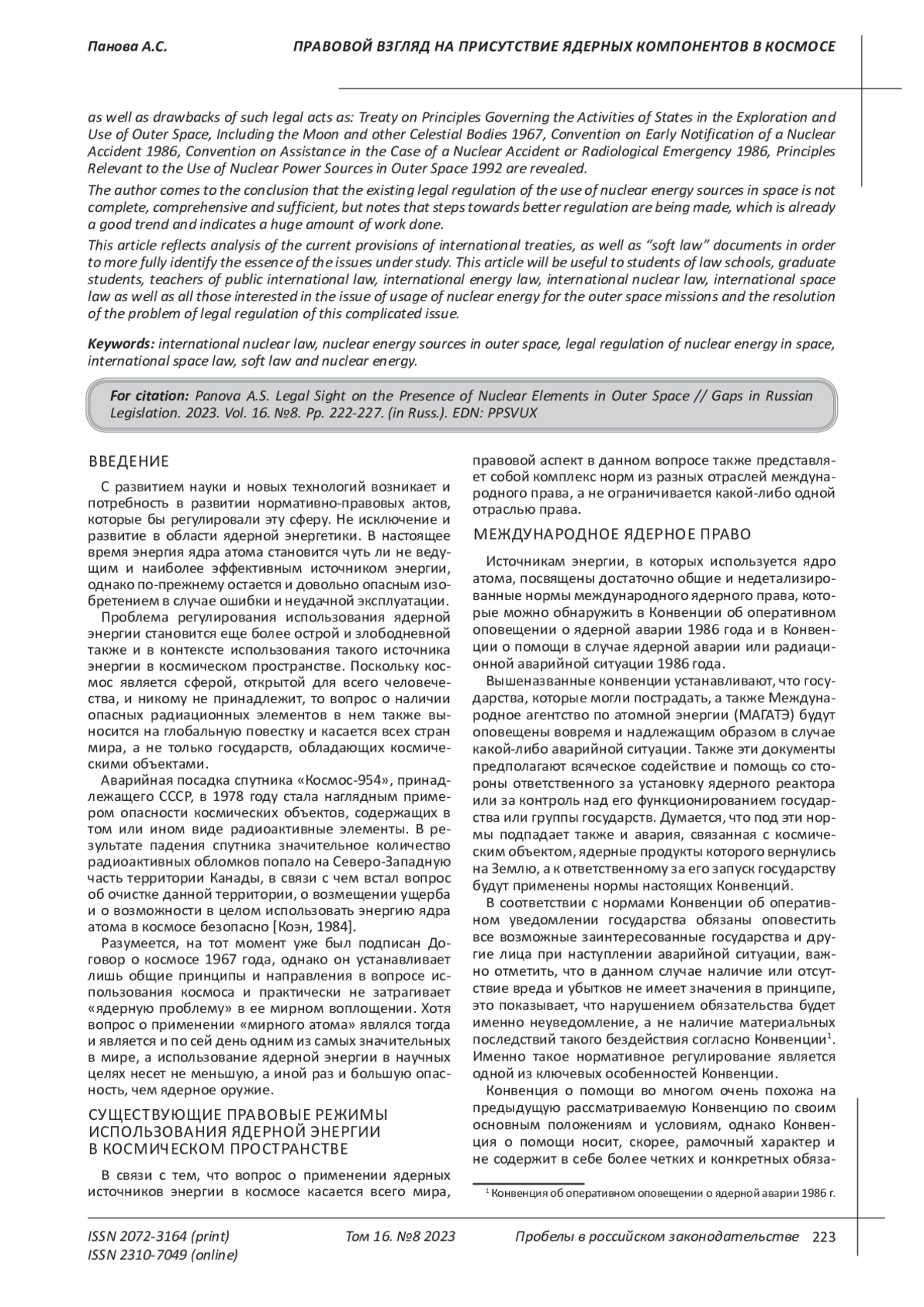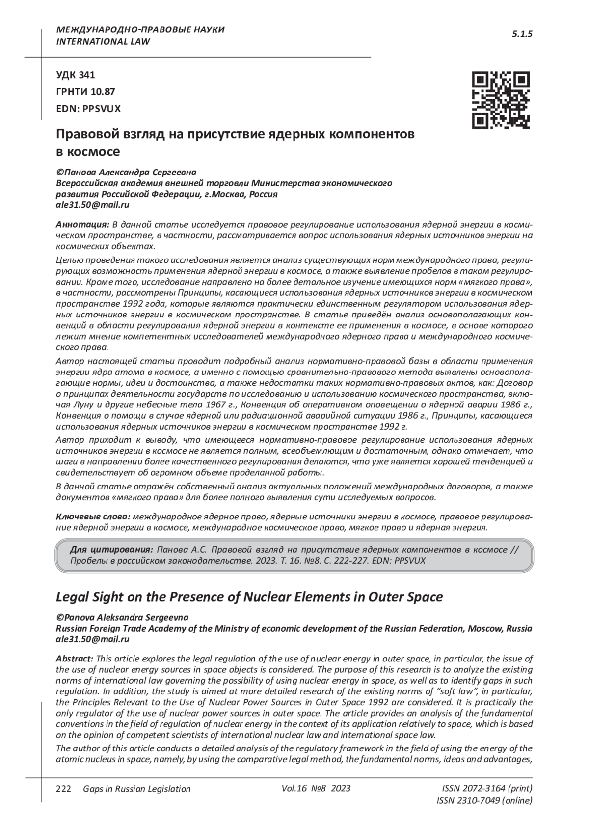 В данной статье исследуется правовое регулирование использования ядерной энергии в космическом пространстве, в частности, рассматривается вопрос использования ядерных источников энергии на космических объектах. Целью проведения такого исследования является анализ существующих норм международного права, регулирующих возможность применения ядерной энергии в космосе, а также выявление пробелов в таком регулировании. Кроме того, исследование направлено на более детальное изучение имеющихся норм «мягкого права», в частности, рассмотрены Принципы, касающиеся использования ядерных источников энергии в космическом пространстве 1992 года, которые являются практически единственным регулятором использования ядерных источников энергии в космическом пространстве. В статье приведён анализ основополагающих конвенций в области регулирования ядерной энергии в контексте ее применения в космосе, в основе которого лежит мнение компетентных исследователей международного ядерного права и международного космического права. Автор настоящей статьи проводит подробный анализ нормативно-правовой базы в области применения энергии ядра атома в космосе, а именно с помощью сравнительно-правового метода выявлены основополагающие нормы, идеи и достоинства, а также недостатки таких нормативно-правовых актов, как: Договор о принципах деятельности государств по исследованию и использованию космического пространства, включая Луну и другие небесные тела 1967 г., Конвенция об оперативном оповещении о ядерной аварии 1986 г., Конвенция о помощи в случае ядерной или радиационной аварийной ситуации 1986 г., Принципы, касающиеся использования ядерных источников энергии в космическом пространстве 1992 г. Автор приходит к выводу, что имеющееся нормативно-правовое регулирование использования ядерных источников энергии в космосе не является полным, всеобъемлющим и достаточным, однако отмечает, что шаги в направлении более качественного регулирования делаются, что уже является хорошей тенденцией и свидетельствует об огромном объеме проделанной работы. В данной статье отражён собственный анализ актуальных положений международных договоров, а также документов «мягкого права» для более полного выявления сути исследуемых вопросов.