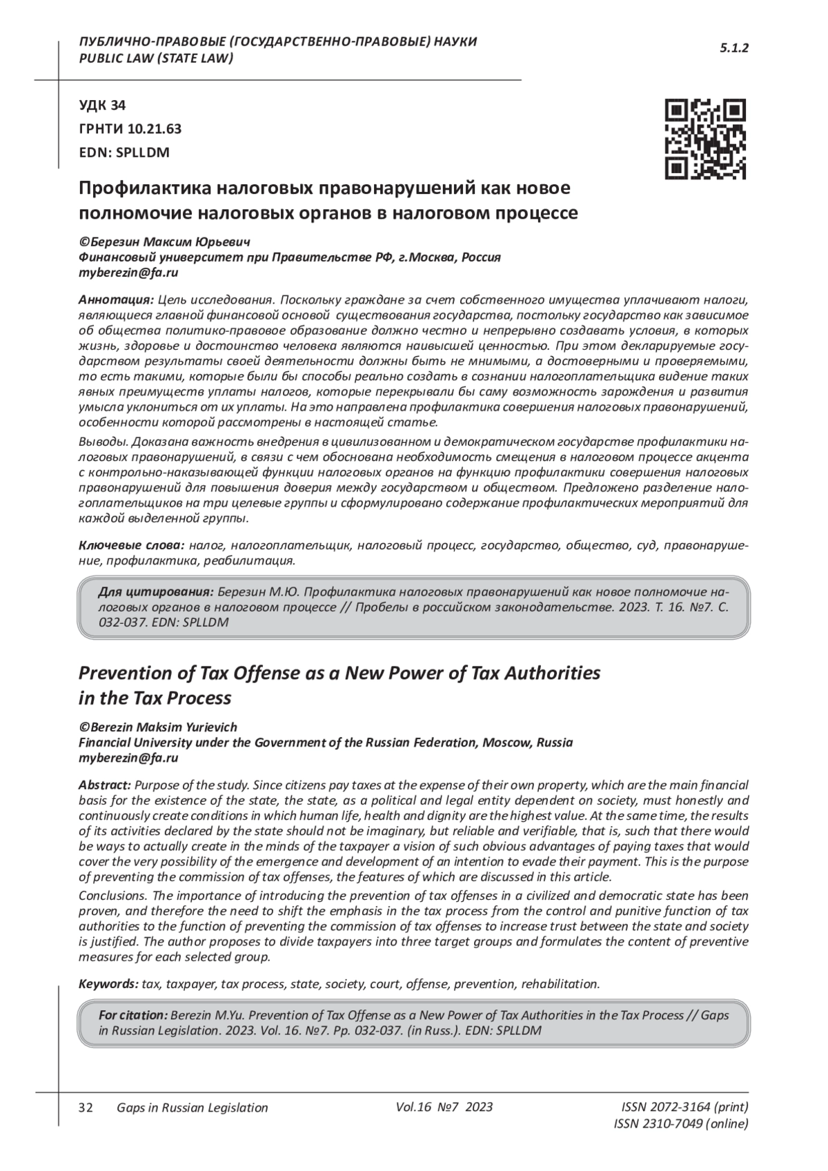 Цель исследования. Поскольку граждане за счет собственного имущества уплачивают налоги, являющиеся главной финансовой основой существования государства, постольку государство как зависимое об общества политико-правовое образование должно честно и непрерывно создавать условия, в которых жизнь, здоровье и достоинство человека являются наивысшей ценностью. При этом декларируемые государством результаты своей деятельности должны быть не мнимыми, а достоверными и проверяемыми, то есть такими, которые были бы способы реально создать в сознании налогоплательщика видение таких явных преимуществ уплаты налогов, которые перекрывали бы саму возможность зарождения и развития умысла уклониться от их уплаты. На это направлена профилактика совершения налоговых правонарушений, особенности которой рассмотрены в настоящей статье. Выводы. Доказана важность внедрения в цивилизованном и демократическом государстве профилактики налоговых правонарушений, в связи с чем обоснована необходимость смещения в налоговом процессе акцента с контрольно-наказывающей функции налоговых органов на функцию профилактики совершения налоговых правонарушений для повышения доверия между государством и обществом. Предложено разделение налогоплательщиков на три целевые группы и сформулировано содержание профилактических мероприятий для каждой выделенной группы.