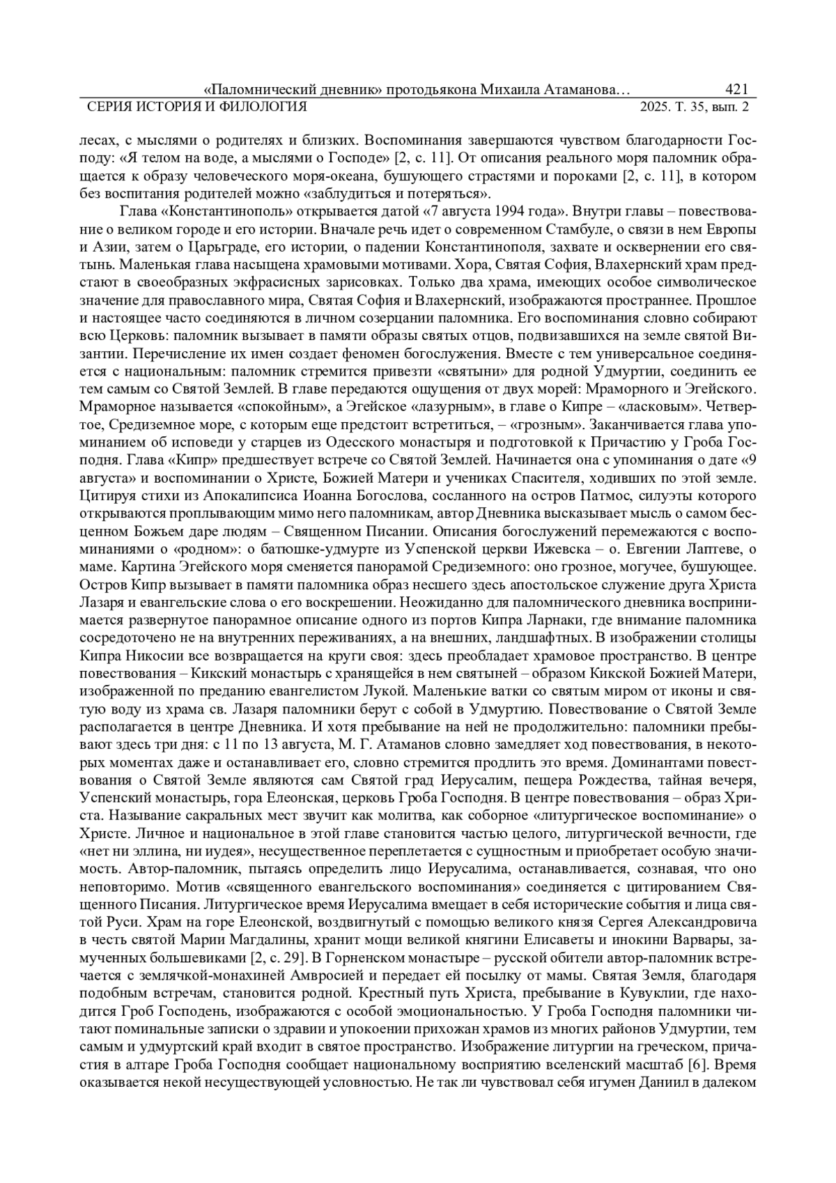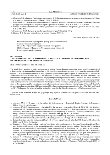 В статье привлекается внимание к такому явлению в современной удмуртской литературе, как духовная проза, не получившему достойного аналитического осмысления в критике, поэтому обращение к текстам, связанным с этим жанром, приобретает особую актуальность. В статье уделяется внимание таким значительным явлениям духовной прозы в современной удмуртской литературе, как «Записки галилейского трудника» В. В. Шкляева и «За четыре моря - в Иерусалим» М. Г. Атаманова. Предметом целостного восприятия в статье является паломнический дневник протодьякона М. Г. Атаманова, рассматриваются поэтические особенности дневника, выявляемые в контексте его сопоставления с каноном жанра хождения. Для паломнического дневника Атаманова свойствен синтез древнерусских жанровых форм: проповеди, жития, церковной гимнографии. Дневник отличается особым, экспрессивным лиризмом, наличием сквозного образа «родной Удмуртии», непосредственным, личным восприятием воспроизводимых ветхозаветных и новозаветных событий. «Большой» и «малый мир» Православия, вселенское и национальное соединяются в Дневнике свойством православной соборности.