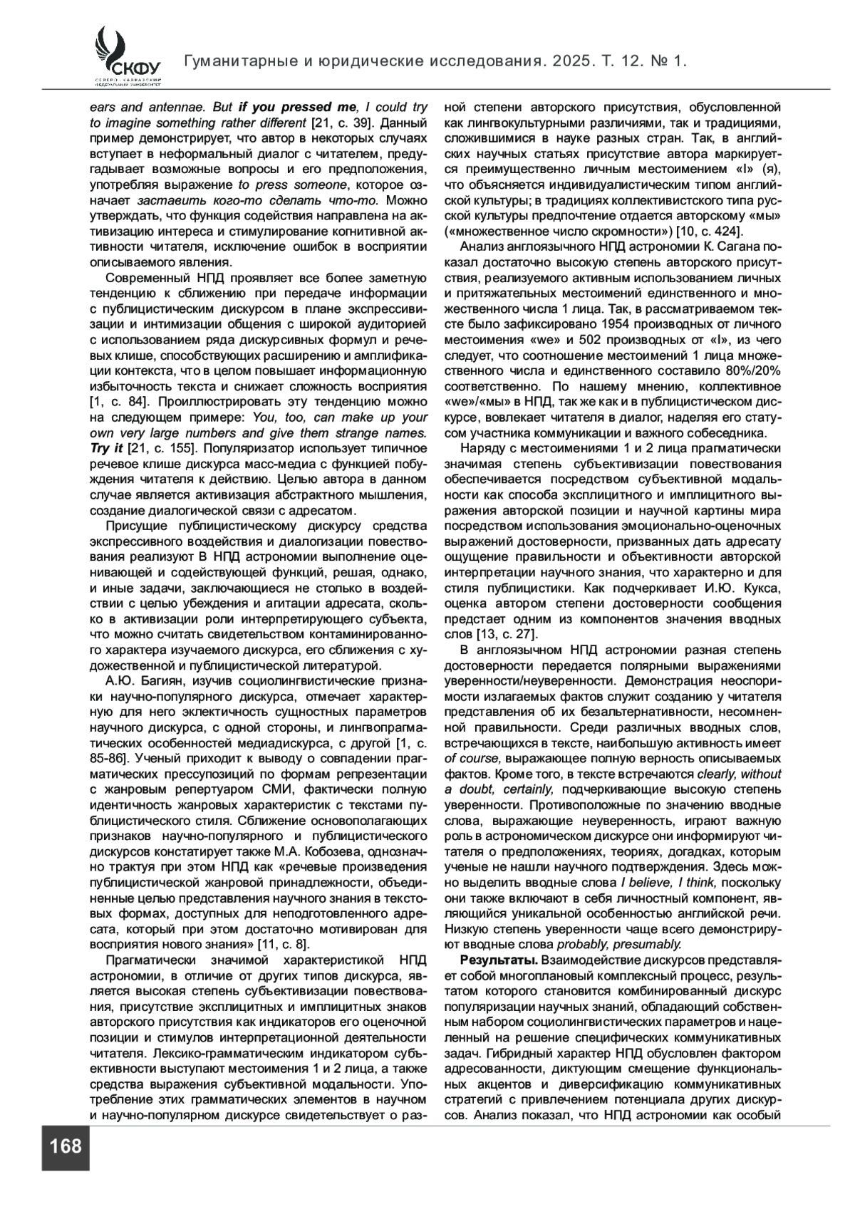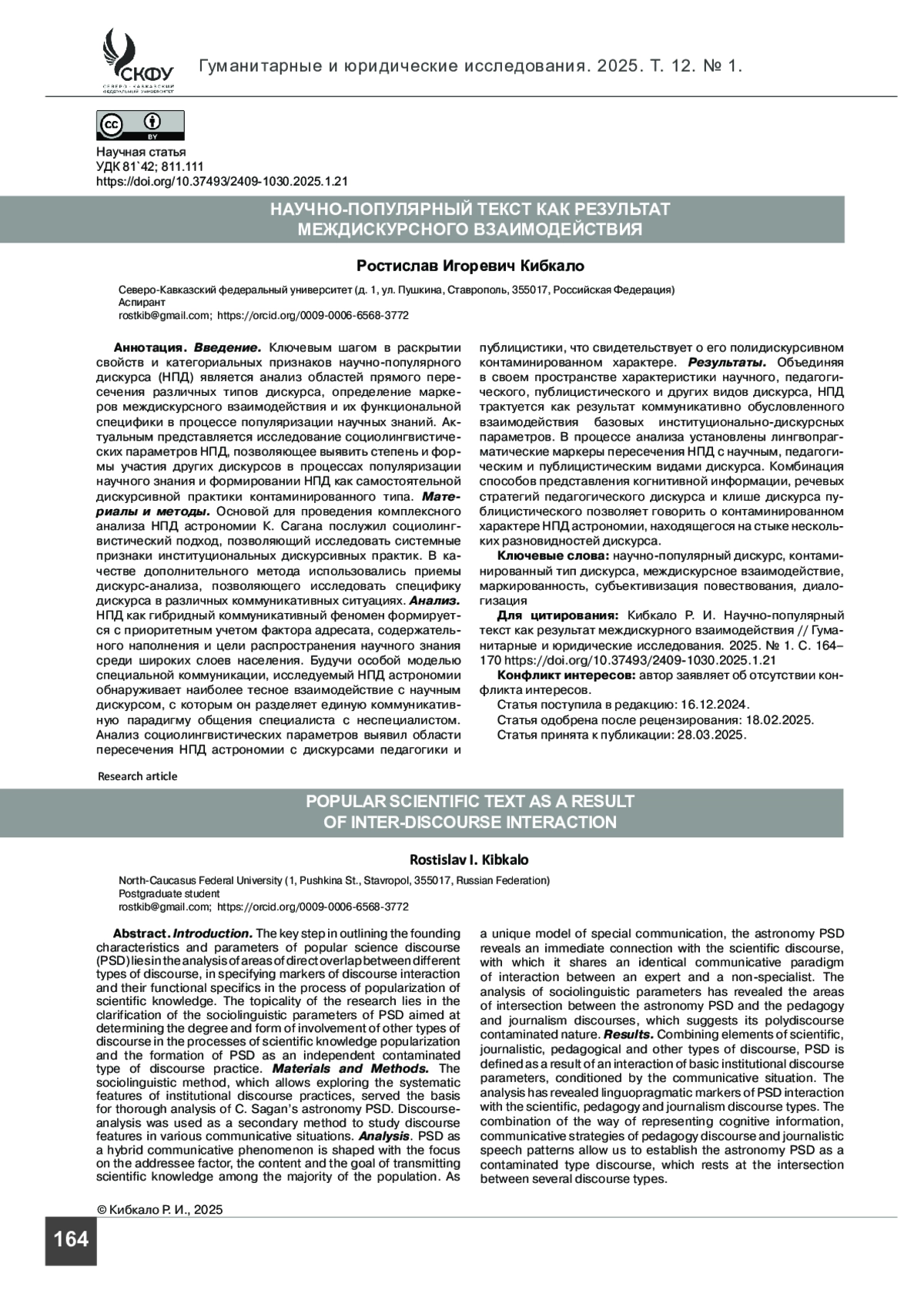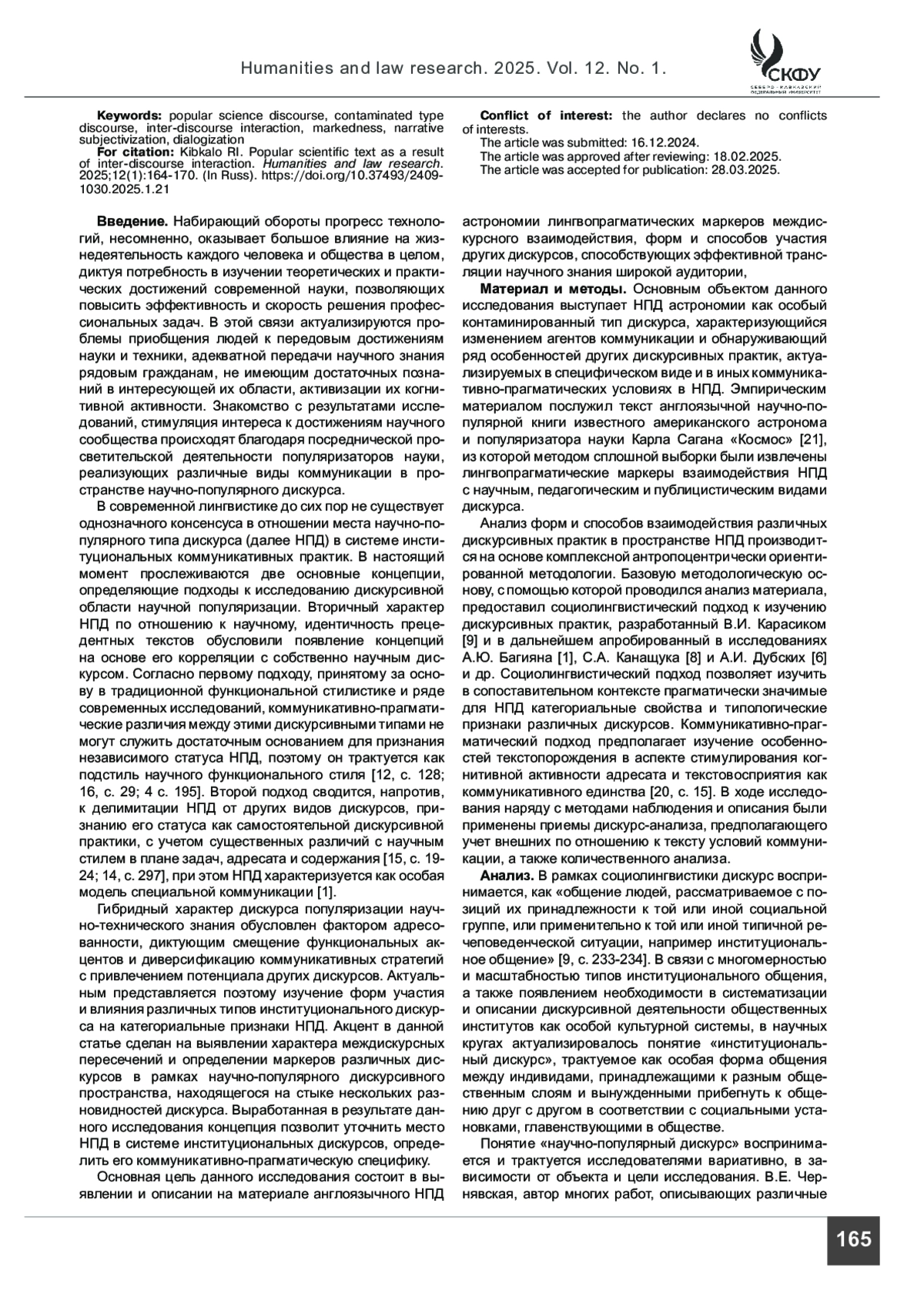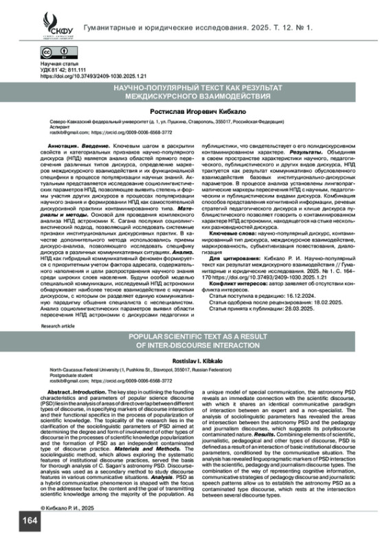 КИБКАЛО Р. И. НАУЧНО-ПОПУЛЯРНЫЙ ТЕКСТ КАК РЕЗУЛЬТАТ МЕЖДИСКУРНОГО ВЗАИМОДЕЙСТВИЯ // ГУМАНИТАРНЫЕ И ЮРИДИЧЕСКИЕ ИССЛЕДОВАНИЯ. 2025. ТОМ 12, № 1