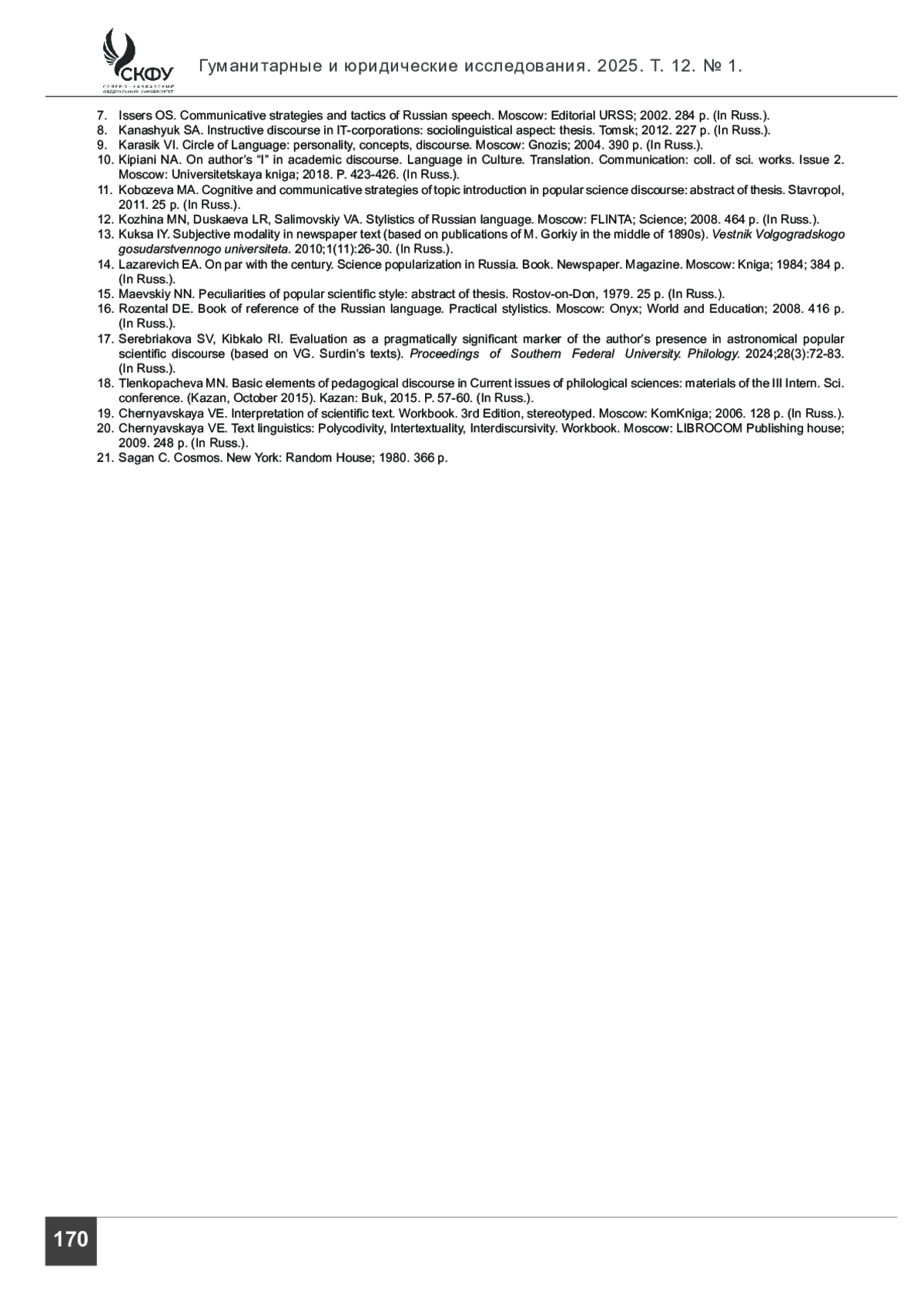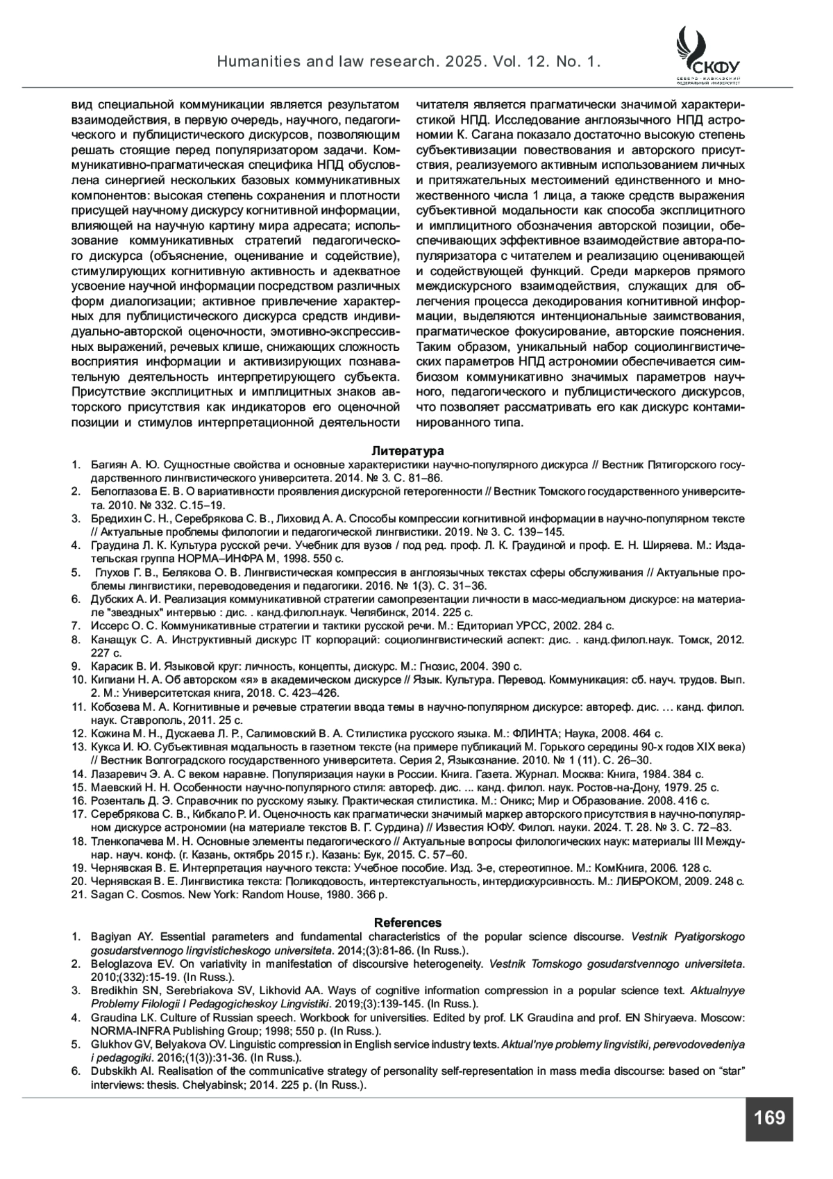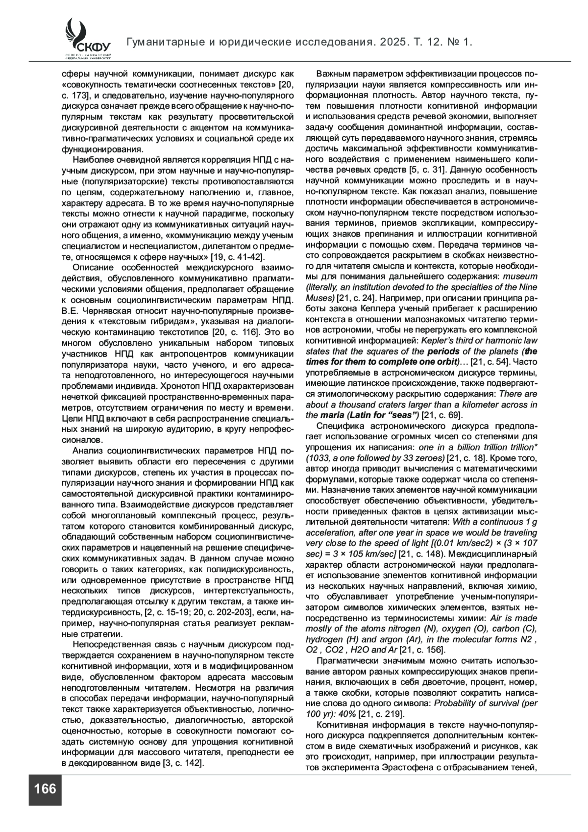 КИБКАЛО Р. И. НАУЧНО-ПОПУЛЯРНЫЙ ТЕКСТ КАК РЕЗУЛЬТАТ МЕЖДИСКУРНОГО ВЗАИМОДЕЙСТВИЯ // ГУМАНИТАРНЫЕ И ЮРИДИЧЕСКИЕ ИССЛЕДОВАНИЯ. 2025. ТОМ 12, № 1