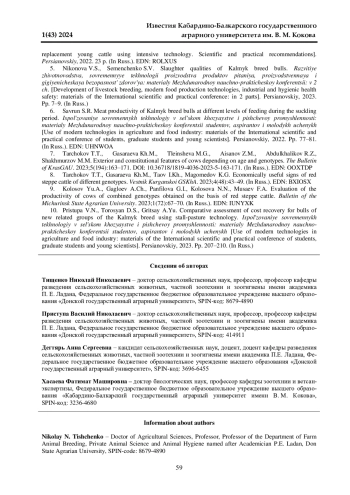 3. Мясная продуктивность бычков разных пород отечественной селекции / В. Н. Приступа, О. Е. Кротова, С. Н. Дудченко, Д. В. Клименко, Л. М. Рашид, М. Ш. Иылдыз // Известия Оренбургского государственного аграрного университета. 2023. № 4(102). С. 255-260. 10.37670/2073-0853-2023- 102-4-255-260. DOI: 10.37670/2073-0853-2023-102-4-255-260 EDN: JSCEYM