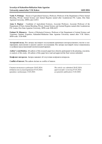 7. Экстерьерно-конституциональные особенности коров в зависимости от возраста и генотипов / Т. Т. Тарчоков, Х. М. Гасараева, М. Г. Тлейншева, З. М. Айсанов, Р. З. Абдулхаликов, М. М. Шахмурзов // Вестник КрасГАУ. 2023. № 5(194). С. 163-171. DOI: 10.36718/1819-4036-2023-5-163-171 EDN: OOXTDP