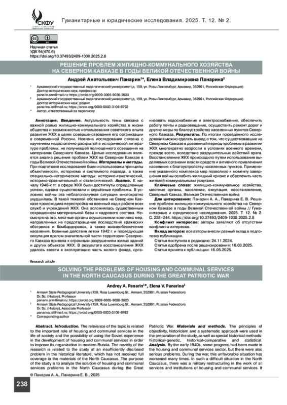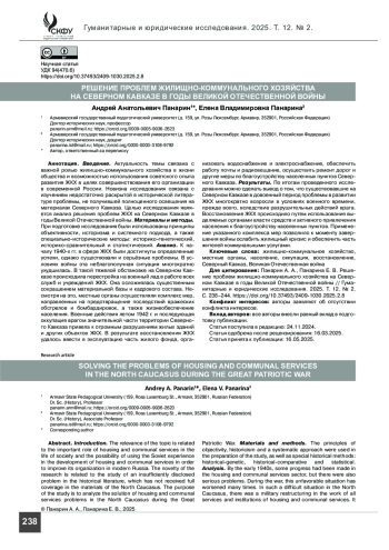 Введение. Актуальность темы связана с важной ролью жилищно-коммунального хозяйства в жизни общества и возможностью использования советского опыта развития ЖКХ в целях совершенствования его организации в современной России. Новизна исследования связана с изучением недостаточно раскрытой в исторической литературе проблемы, не получившей полноценного освещения на материалах Северного Кавказа. Целью исследования является анализ решения проблем ЖКХ на Северном Кавказе в годы Великой Отечественной войны.