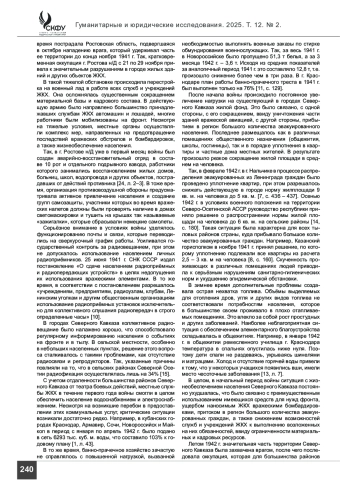 Анализ. К началу 1940-х гг. в сфере ЖКХ были достигнуты определенные успехи, однако существовали и серьёзные проблемы. В условиях войны эта неблагополучная ситуация многократно ухудшилась. В такой тяжелой обстановке на Северном Кавказе происходила перестройка на военный лад в работе всех служб и учреждений ЖКХ. Она осложнялась существенным сокращением материальной базы и кадрового состава. Несмотря на это, местные органы осуществляли комплекс мер, направленных на предотвращение последствий вражеских обстрелов и бомбардировок, а также жизнеобеспечение населения. Военные действия летом 1942 г. и последующая оккупация врагом значительной части территории Северного Кавказа привела к огромным разрушениям жилых зданий и других объектов ЖКХ. В результате восстановления ЖКХ удалось ввести в эксплуатацию часть жилого фонда, организовать водоснабжение и электроснабжение, обеспечить работу почты и радиовещание, осуществить ремонт дорог и другие меры по благоустройству населенных пунктов Северного Кавказа.