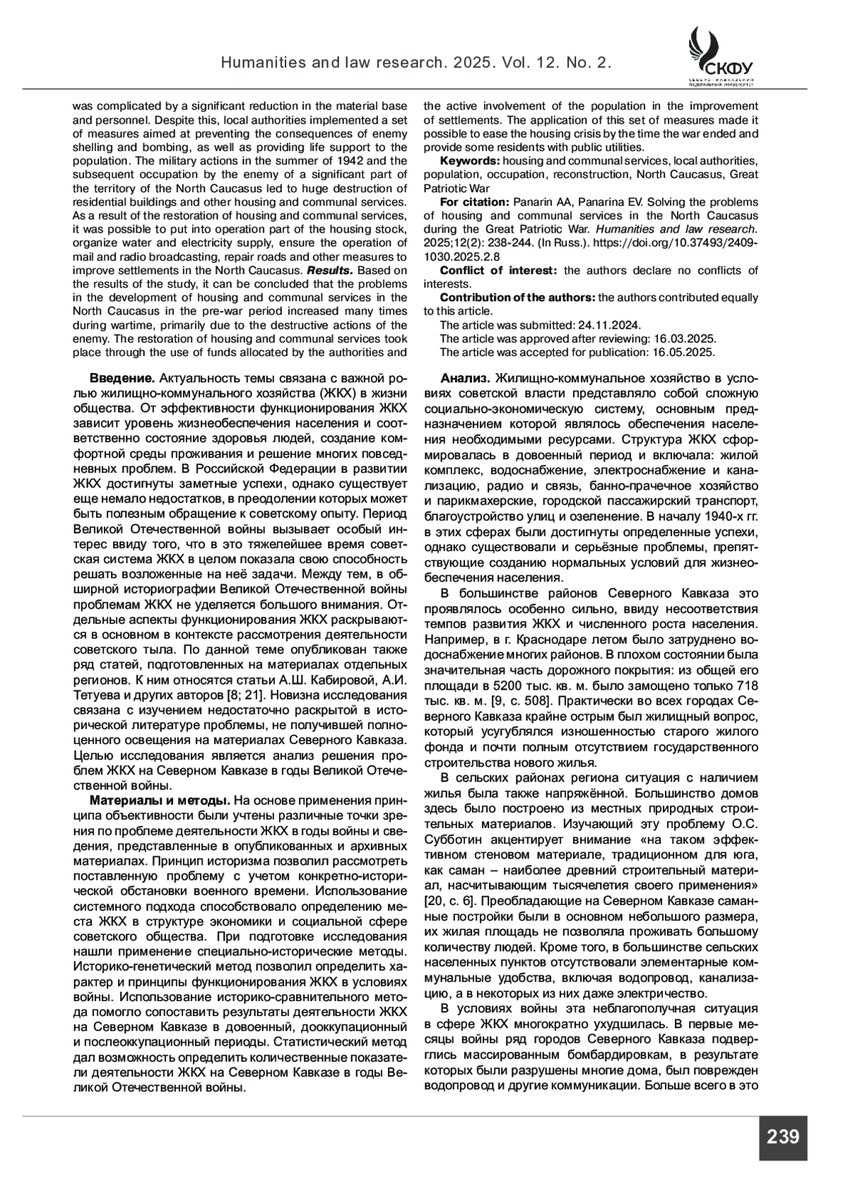 Результаты. По итогам проведенного исследования можно сделать вывод о том, что существовавшие на Северном Кавказе в довоенный период проблемы в развитии ЖКХ многократно возросли в условиях военного времени, прежде всего, вследствие разрушительных действий врага. Восстановление ЖКХ происходило путем использования выделяемых органами власти средств и активного привлечения населения к благоустройству населенных пунктов. Применение указанного комплекса мер позволило к моменту завершения войны ослабить жилищный кризис и обеспечить часть жителей коммунальными услугами.