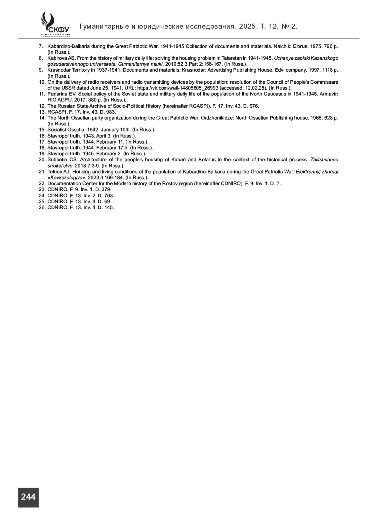 21. Тетуев А. И. Жилищно-бытовые условия населения Кабардино-Балкарии в годы Великой Отечественной войны // Электронный журнал «Кавказология». 2023. № 3. С. 169-184.