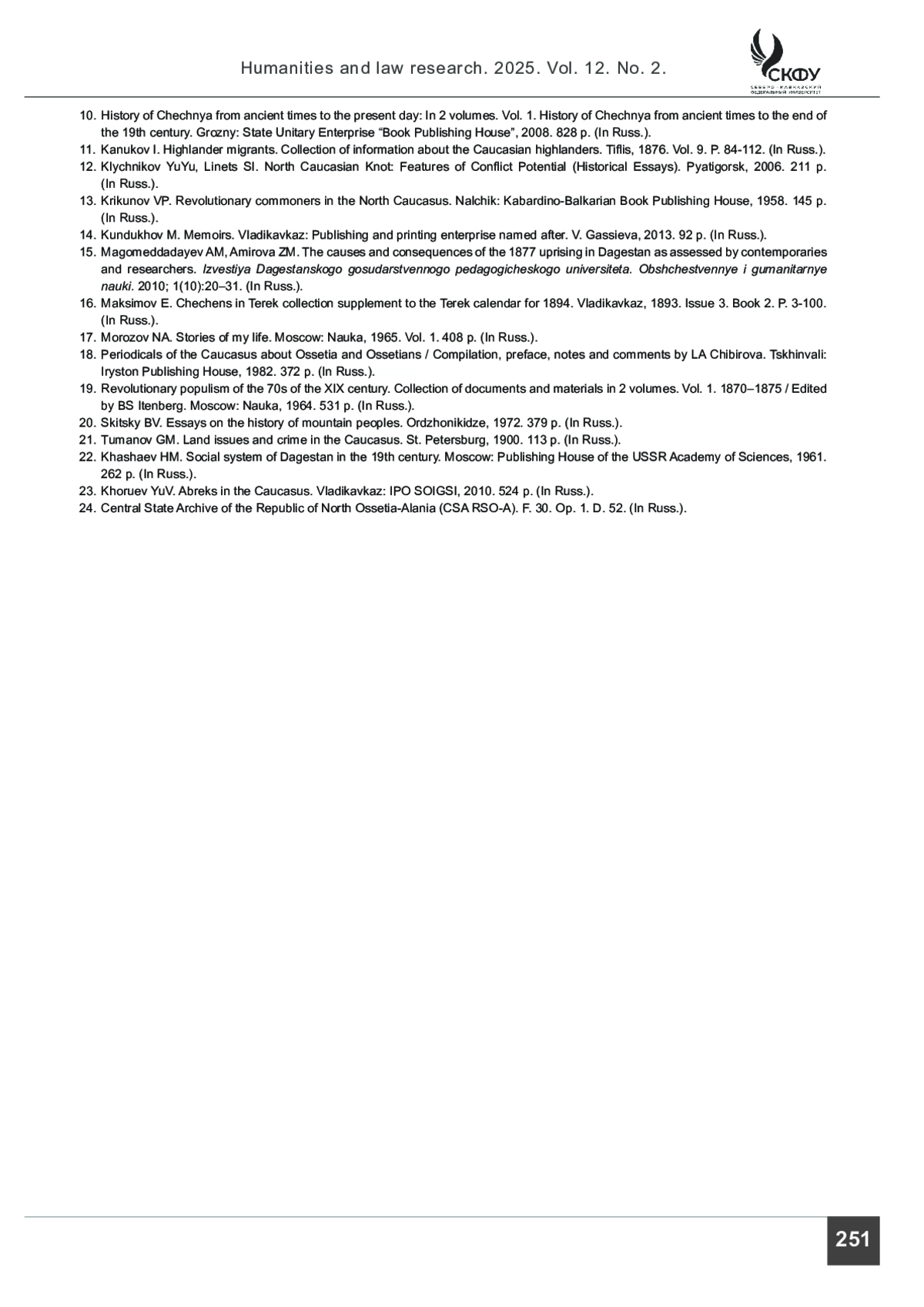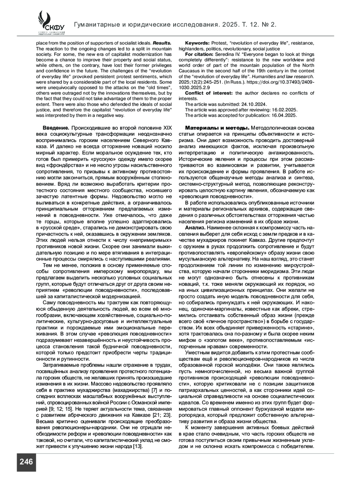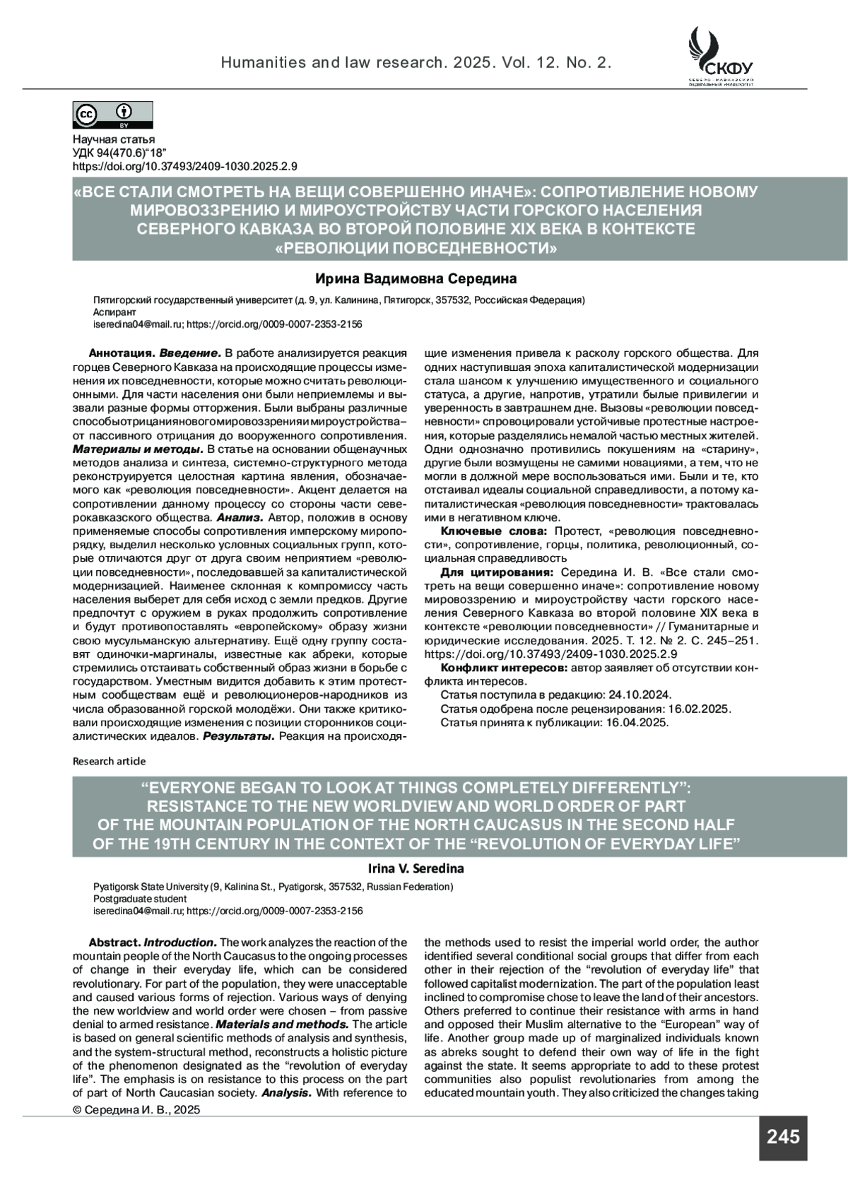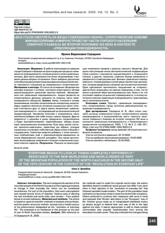 СЕРЕДИНА И. В. «ВСЕ СТАЛИ СМОТРЕТЬ НА ВЕЩИ СОВЕРШЕННО ИНАЧЕ»: СОПРОТИВЛЕНИЕ НОВОМУ МИРОВОЗЗРЕНИЮ И МИРОУСТРОЙСТВУ ЧАСТИ ГОРСКОГО НАСЕЛЕНИЯ СЕВЕРНОГО КАВКАЗА ВО ВТОРОЙ ПОЛОВИНЕ XIX ВЕКА В КОНТЕКСТЕ «РЕВОЛЮЦИИ ПОВСЕДНЕВНОСТИ» // ГУМАНИТАРНЫЕ И ЮРИДИЧЕСКИЕ ИССЛЕДОВАНИЯ. 2025. ТОМ 12, № 2