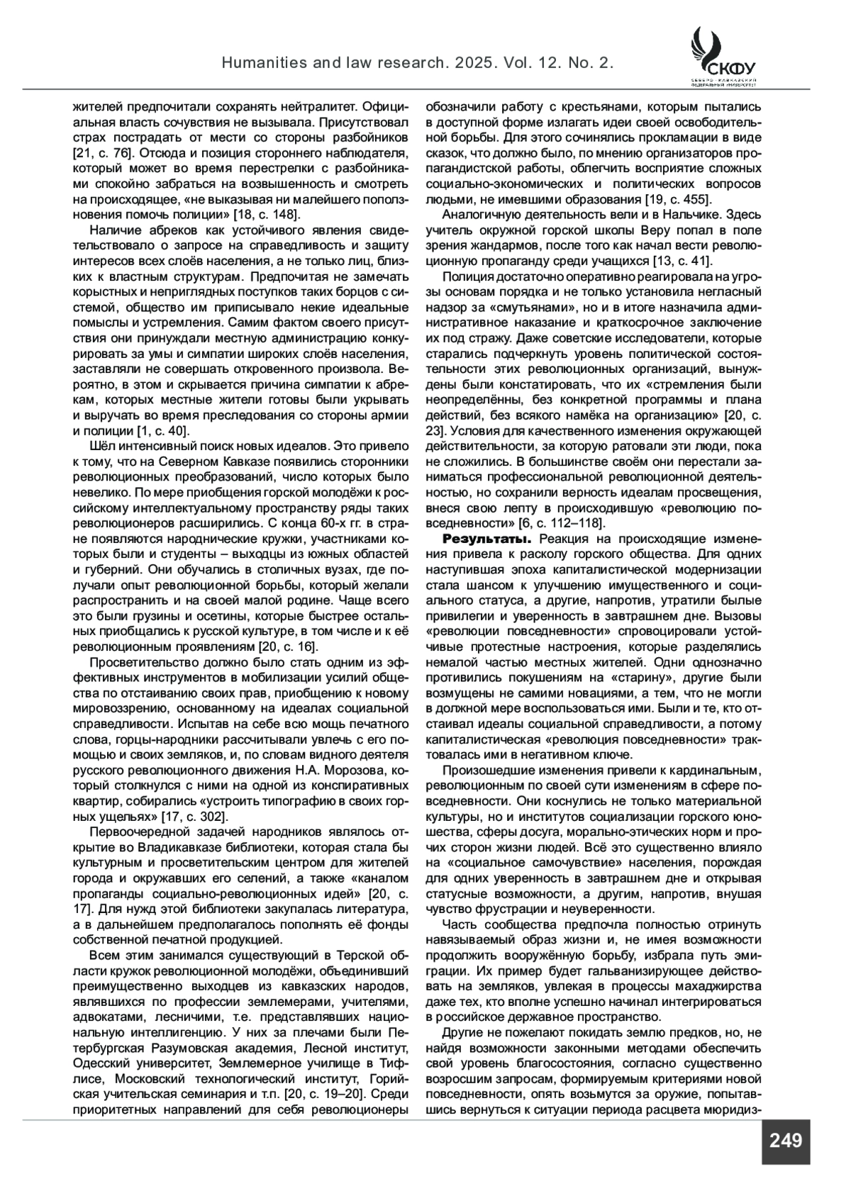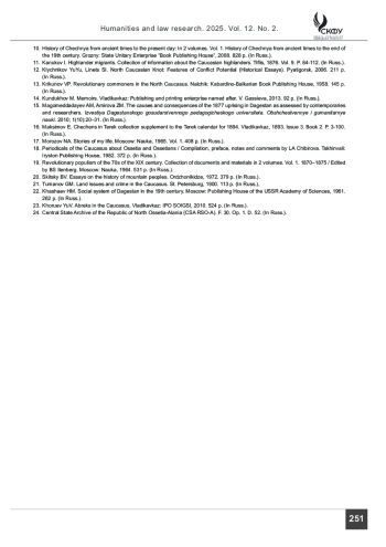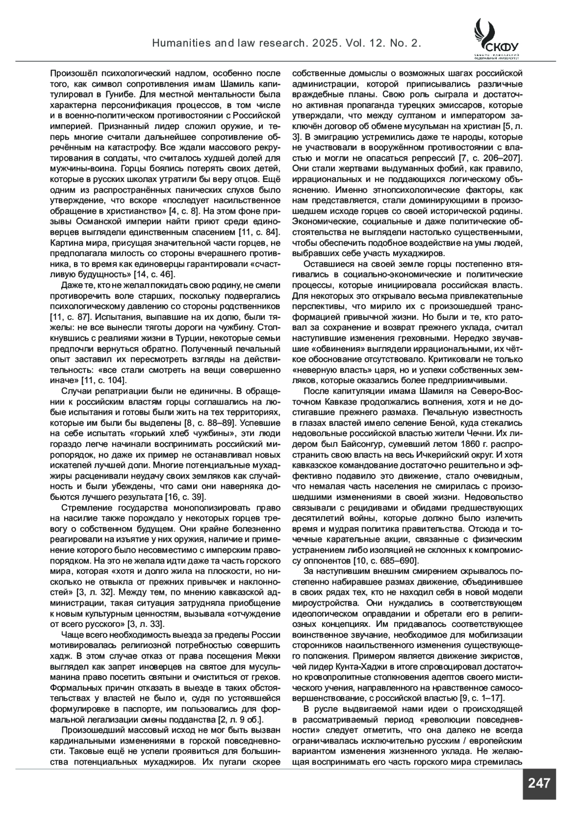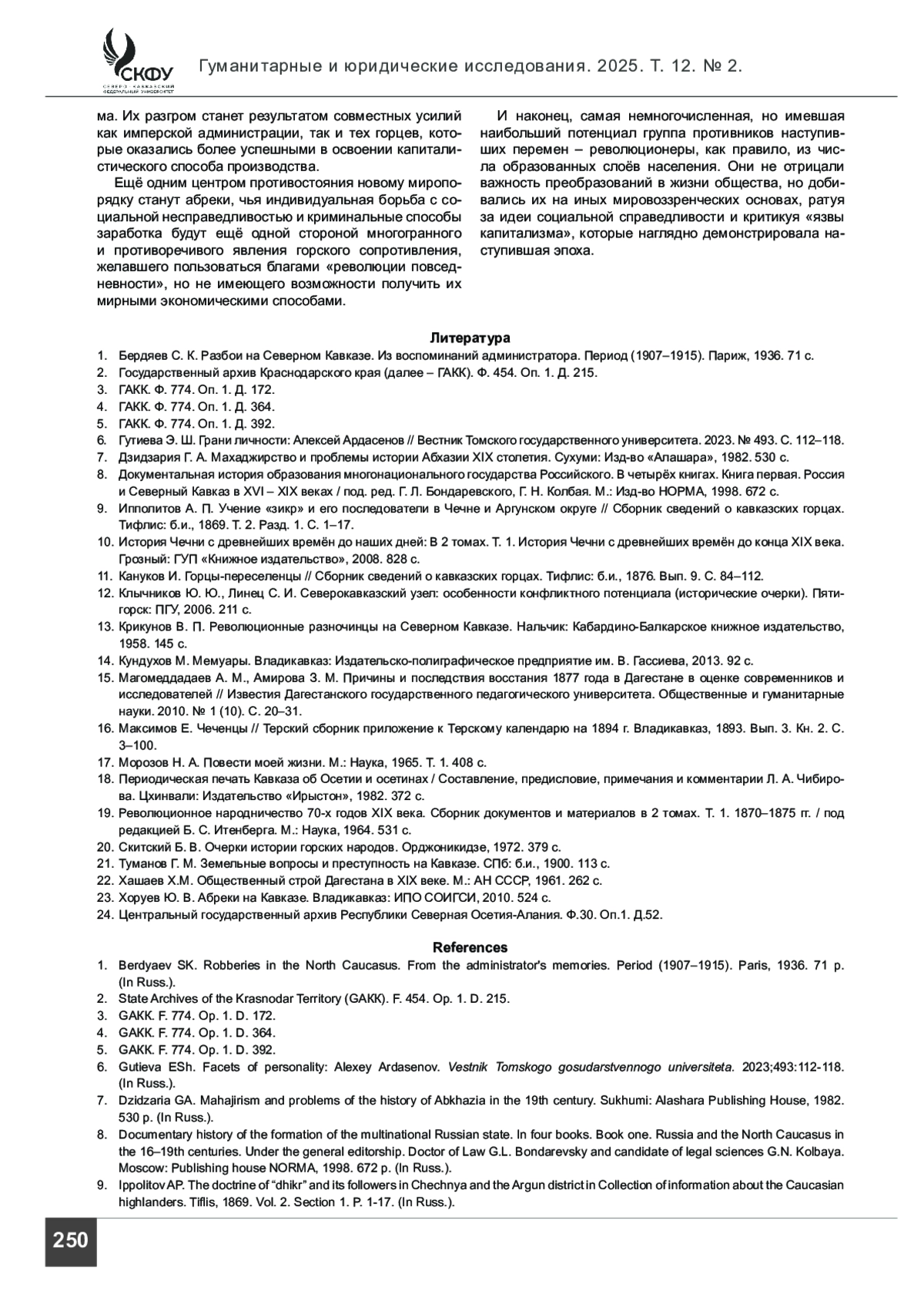 СЕРЕДИНА И. В. «ВСЕ СТАЛИ СМОТРЕТЬ НА ВЕЩИ СОВЕРШЕННО ИНАЧЕ»: СОПРОТИВЛЕНИЕ НОВОМУ МИРОВОЗЗРЕНИЮ И МИРОУСТРОЙСТВУ ЧАСТИ ГОРСКОГО НАСЕЛЕНИЯ СЕВЕРНОГО КАВКАЗА ВО ВТОРОЙ ПОЛОВИНЕ XIX ВЕКА В КОНТЕКСТЕ «РЕВОЛЮЦИИ ПОВСЕДНЕВНОСТИ» // ГУМАНИТАРНЫЕ И ЮРИДИЧЕСКИЕ ИССЛЕДОВАНИЯ. 2025. ТОМ 12, № 2