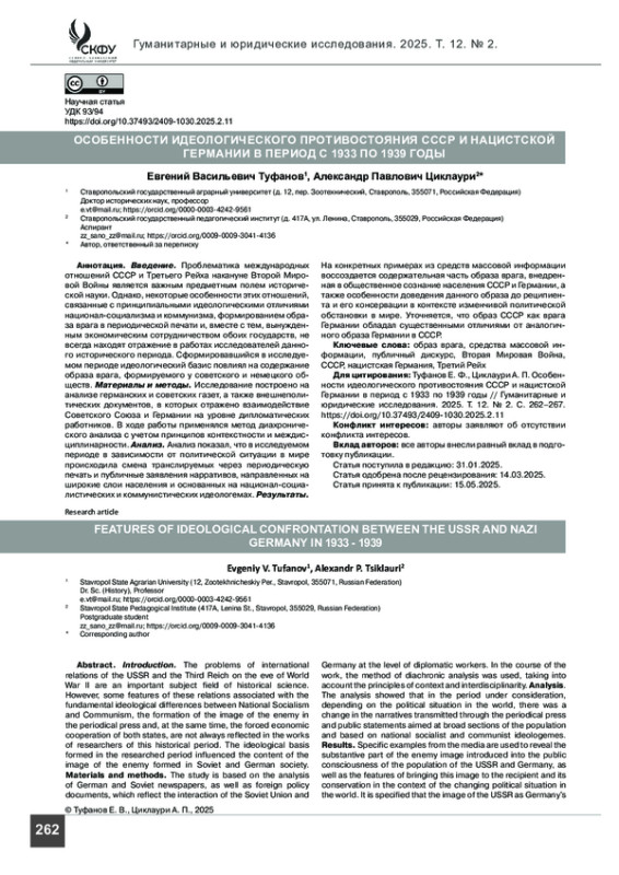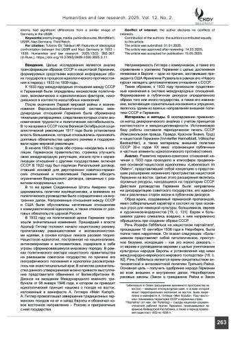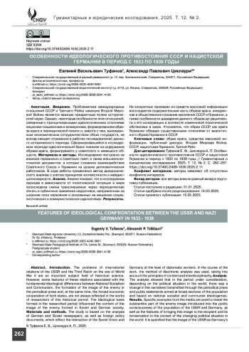 Введение. Проблематика международных отношений СССР и Третьего Рейха накануне Второй Мировой Войны является важным предметным полем исторической науки. Однако, некоторые особенности этих отношений, связанные с принципиальными идеологическими отличиями национал-социализма и коммунизма, формированием образа врага в периодической печати и, вместе с тем, вынужденным экономическим сотрудничеством обоих государств, не всегда находят отражение в работах исследователей данного исторического периода. Сформировавшийся в исследуемом периоде идеологический базис повлиял на содержание образа врага, формируемого у советского и немецкого обществ.