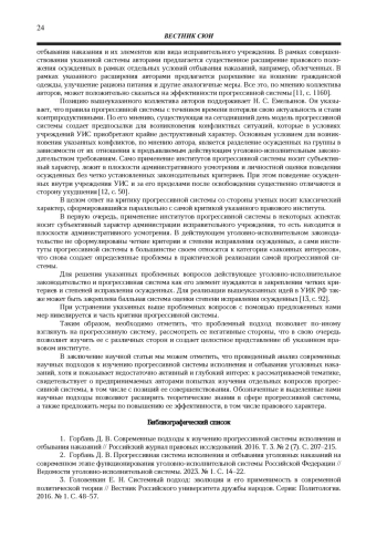 12. Емельянов Н. С. Прикладные проблемы прогрессивной системы исполнения наказаний в виде лишения свободы // Вестник Томского института повышения квалификации работников ФСИН России. 2024. № 4 (22). С. 47-53. EDN: PSZCFS