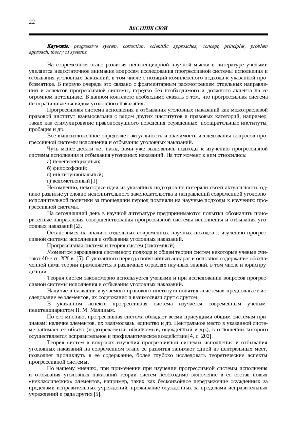 4. Малин П. М. О системном статусе объекта прогрессивной системы исполнения и отбывания лишения свободы // Уголовно-исполнительное право. 2024. Т. 19. № 2. С. 200-209. EDN: FQZQXN